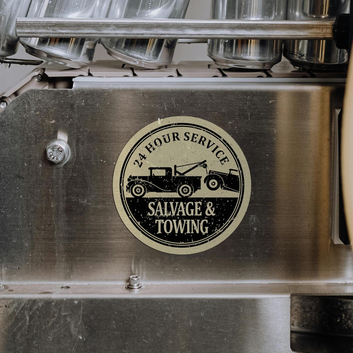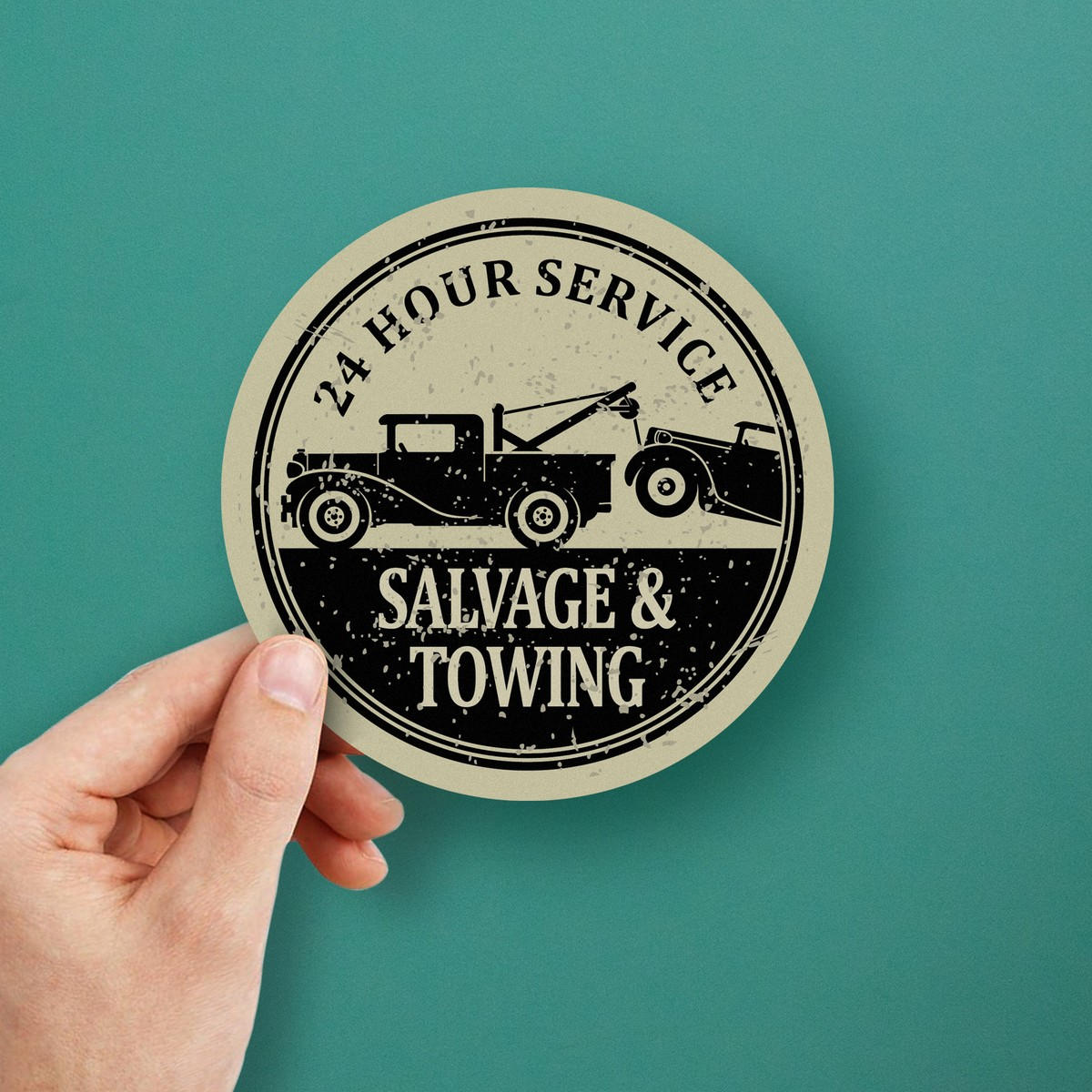 Bring a professional and vintage flair to your service vehicle or space with this 24 Hour Service Salvage & Towing vinyl sticker. Perfect for cars, trucks, or walls, this durable decal features a retro-inspired design ideal for towing companies, garages, or service stations. Built from high-quality vinyl, it is weatherproof and fade-resistant, ensuring long-lasting use both indoors and outdoors. With its simple peel-and-stick application, this decal is easy to apply and remove without leaving residue behind. Available in multiple size options, it’s a must-have for any business looking to enhance its branding.