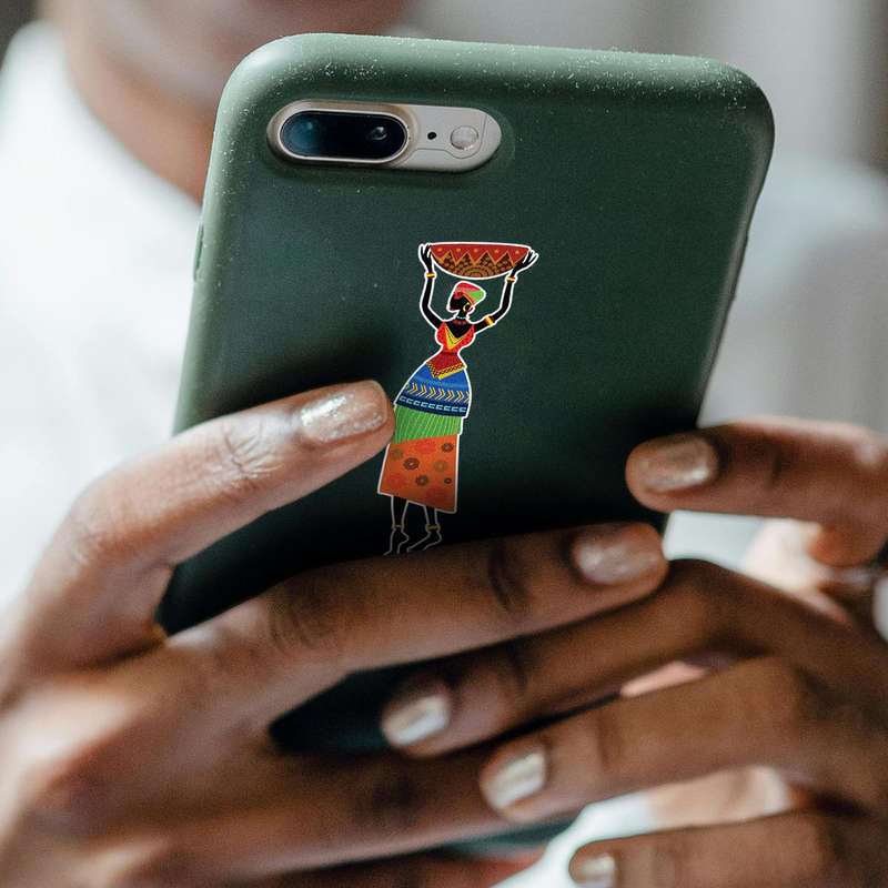 Celebrate African culture with this elegant silhouette sticker, featuring a vibrant design of a woman carrying a basket in traditional attire. The bold patterns in orange, green, blue, and red make this decal a stunning piece of art. Crafted from durable vinyl, it’s weatherproof and fade-resistant, making it ideal for cars, laptops, water bottles, or home decor. Easy to apply and remove without residue, this sticker offers hassle-free customization. Available in multiple sizes, it’s a perfect choice for adding cultural beauty and vibrant style to your belongings.