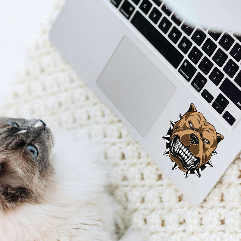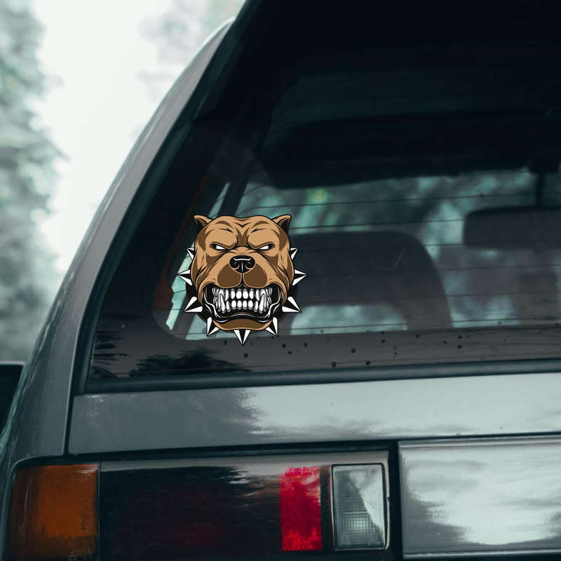 Make a bold statement with this aggressive Pitbull head sticker, showcasing a detailed brown and black design complete with a fierce spiked collar. Crafted from high-quality vinyl, this decal is perfect for cars, laptops, toolboxes, or any gear you want to personalize with a rugged touch. Its weatherproof construction ensures it can endure outdoor conditions while retaining its striking look. Simple to apply and remove without residue, this decal combines practicality with bold style. Available in multiple size options, it’s a perfect way to express strength and individuality.