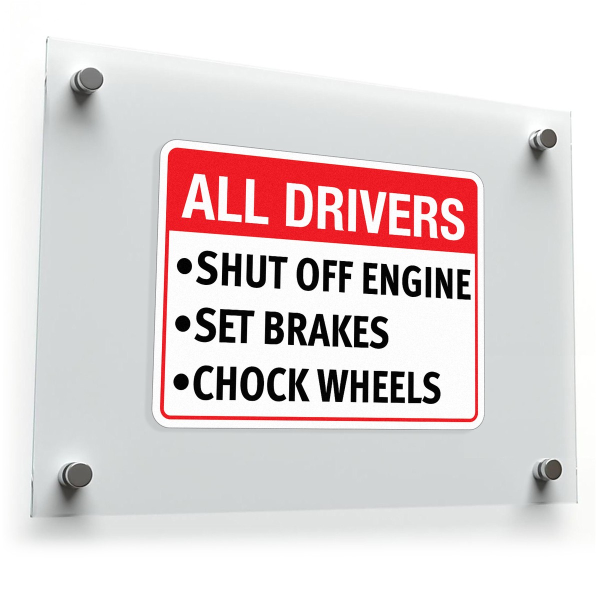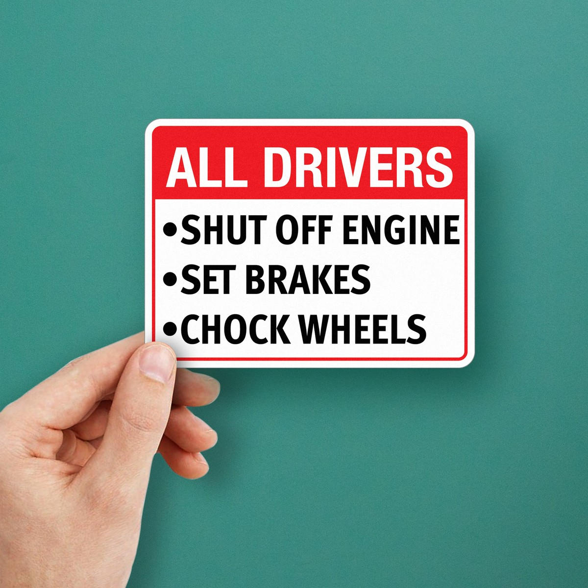 Ensure a safe and secure work environment with this “All Drivers” safety sign decal. Featuring a clear and bold message to shut off engines, set brakes, and chock wheels, this vinyl sticker is designed for industrial settings such as loading docks, warehouses, and construction sites. Made from durable, weather-resistant vinyl, it can withstand harsh conditions while maintaining visibility. Easy to apply and remove without residue, this safety decal promotes critical safety protocols, helping to prevent accidents and ensuring drivers follow essential safety steps.