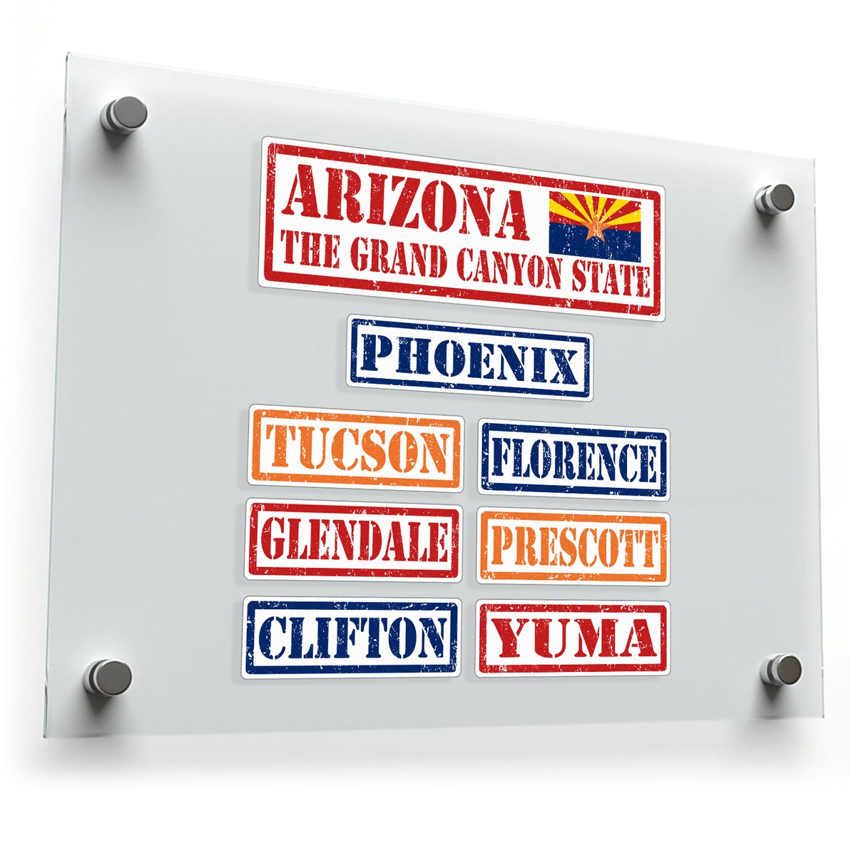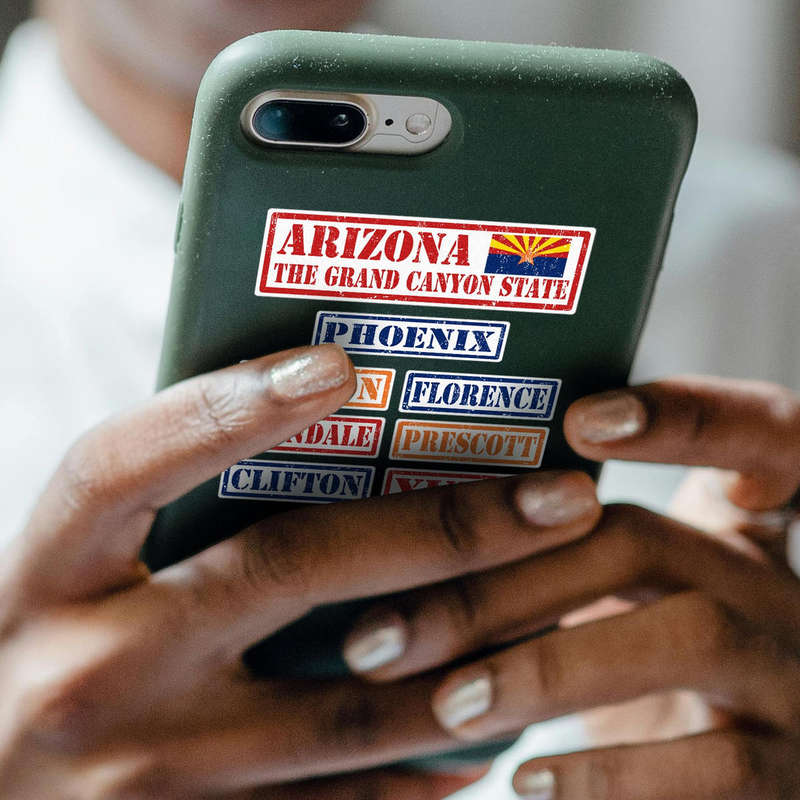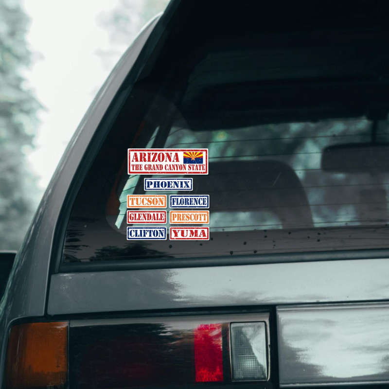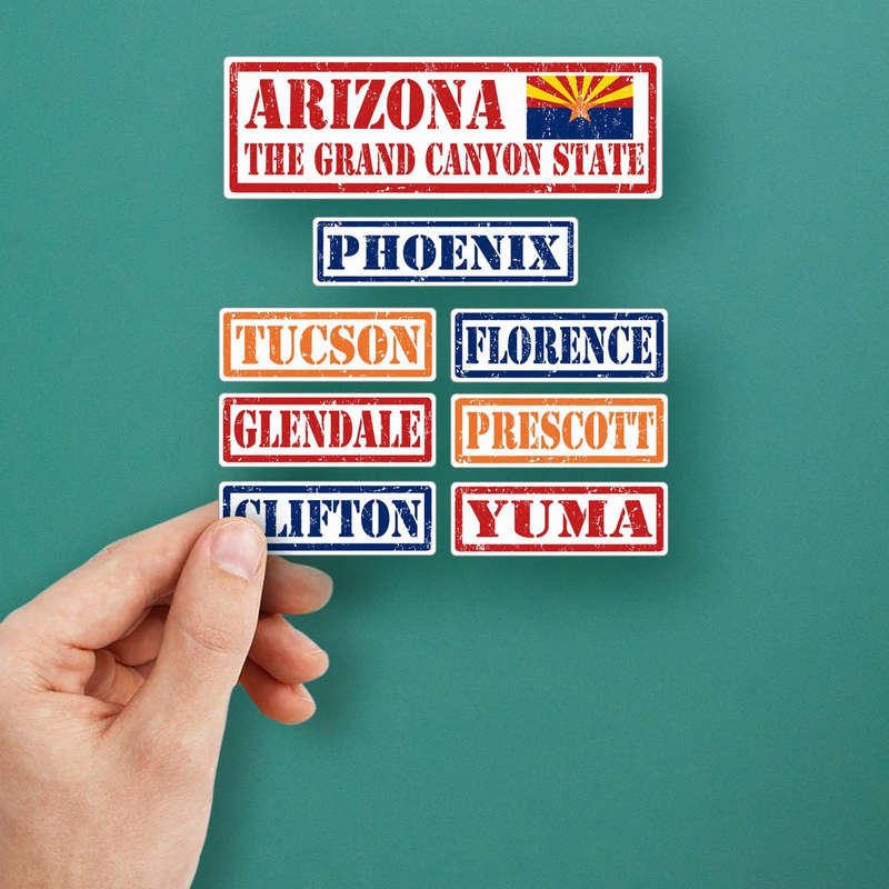 Show your love for the Grand Canyon State with this Arizona-themed vinyl sticker set. Featuring a vintage-style design, the set includes bold decals of the Arizona state flag, the Grand Canyon State slogan, and city names like Phoenix, Tucson, and Yuma. Perfect for personalizing cars, laptops, or travel gear, these stickers add a retro charm to any surface. Crafted from durable, weatherproof vinyl, they resist fading and peeling, making them suitable for both indoor and outdoor use. Easy to apply and residue-free upon removal, these stickers are a must-have for travelers, locals, or anyone with a connection to Arizona.