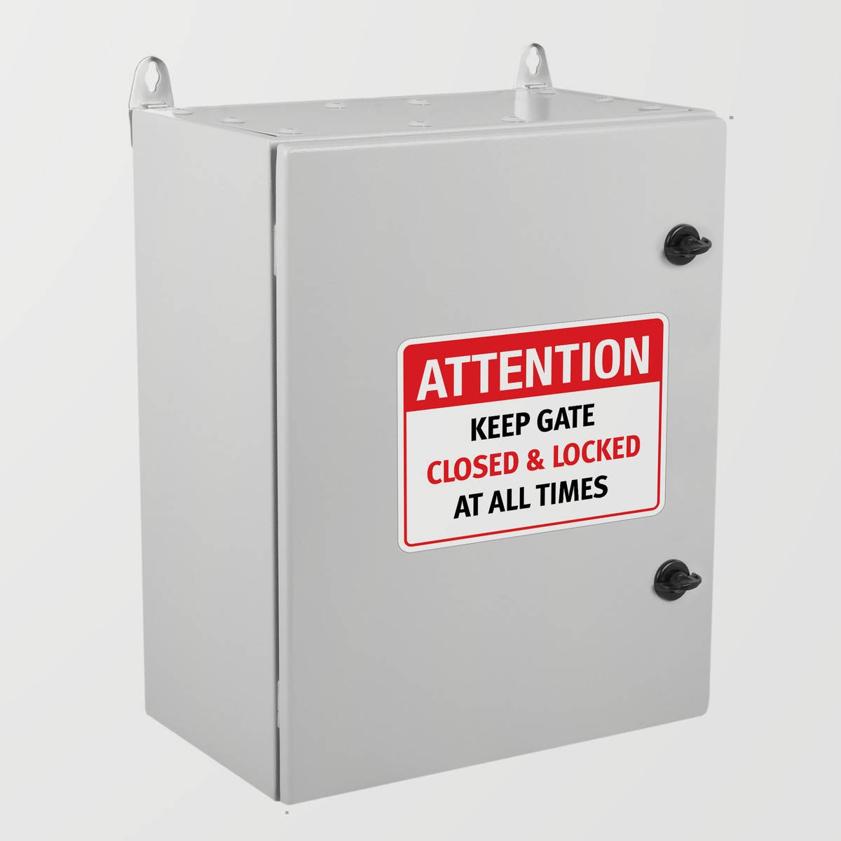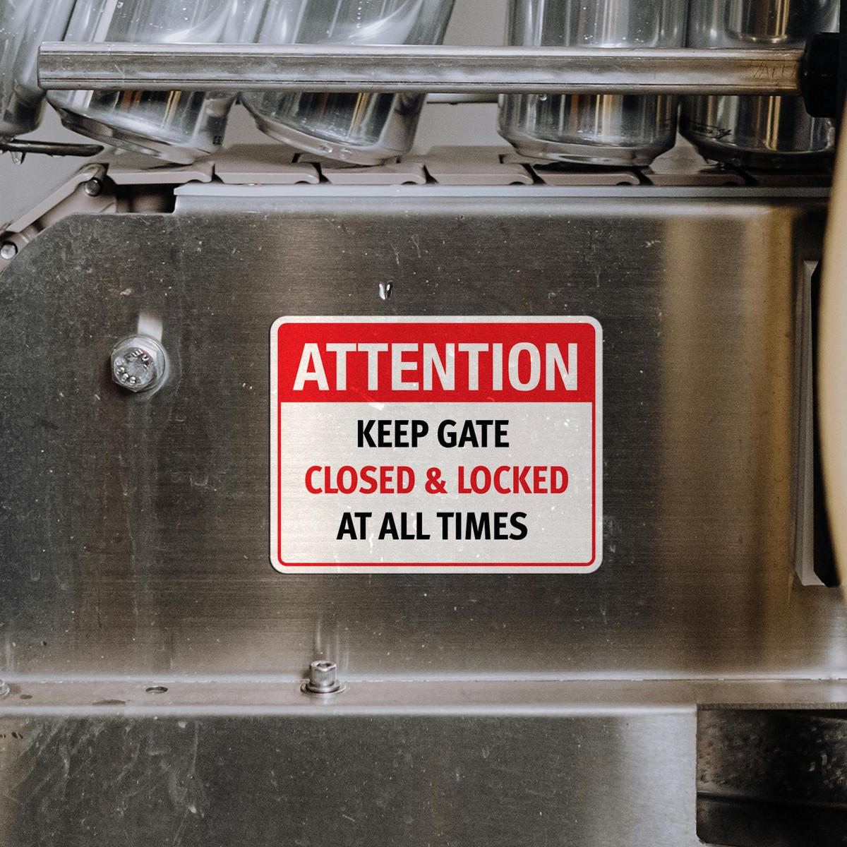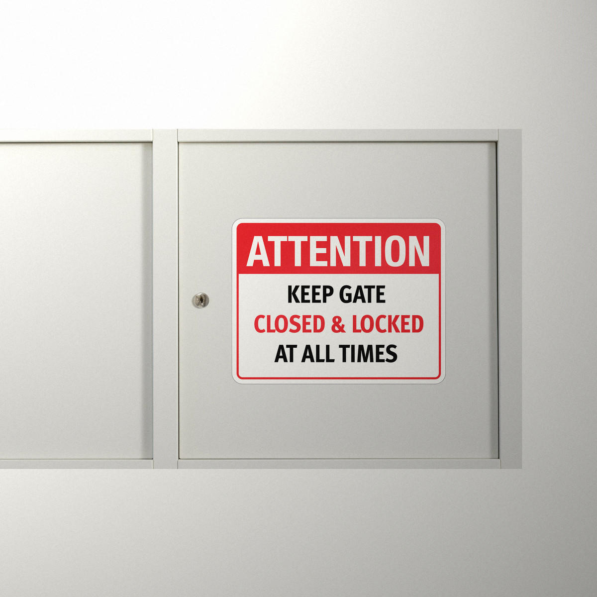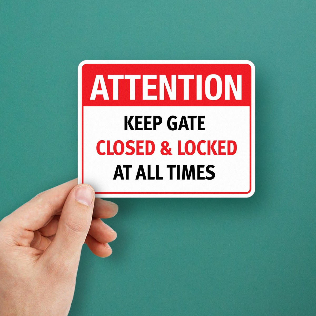 Promote safety and security with this “Attention – Keep Gate Closed & Locked” sign sticker. Ideal for use on security gates, industrial doors, and restricted areas, this bold vinyl decal provides a clear reminder to maintain security protocols at all times. Made from durable vinyl, the sticker is weatherproof and designed to withstand harsh outdoor conditions. Its high-contrast design ensures visibility from a distance, making it perfect for both permanent and temporary use in high-traffic areas. Available in multiple size options to suit your specific needs.