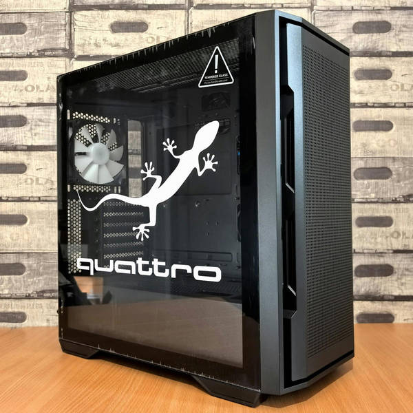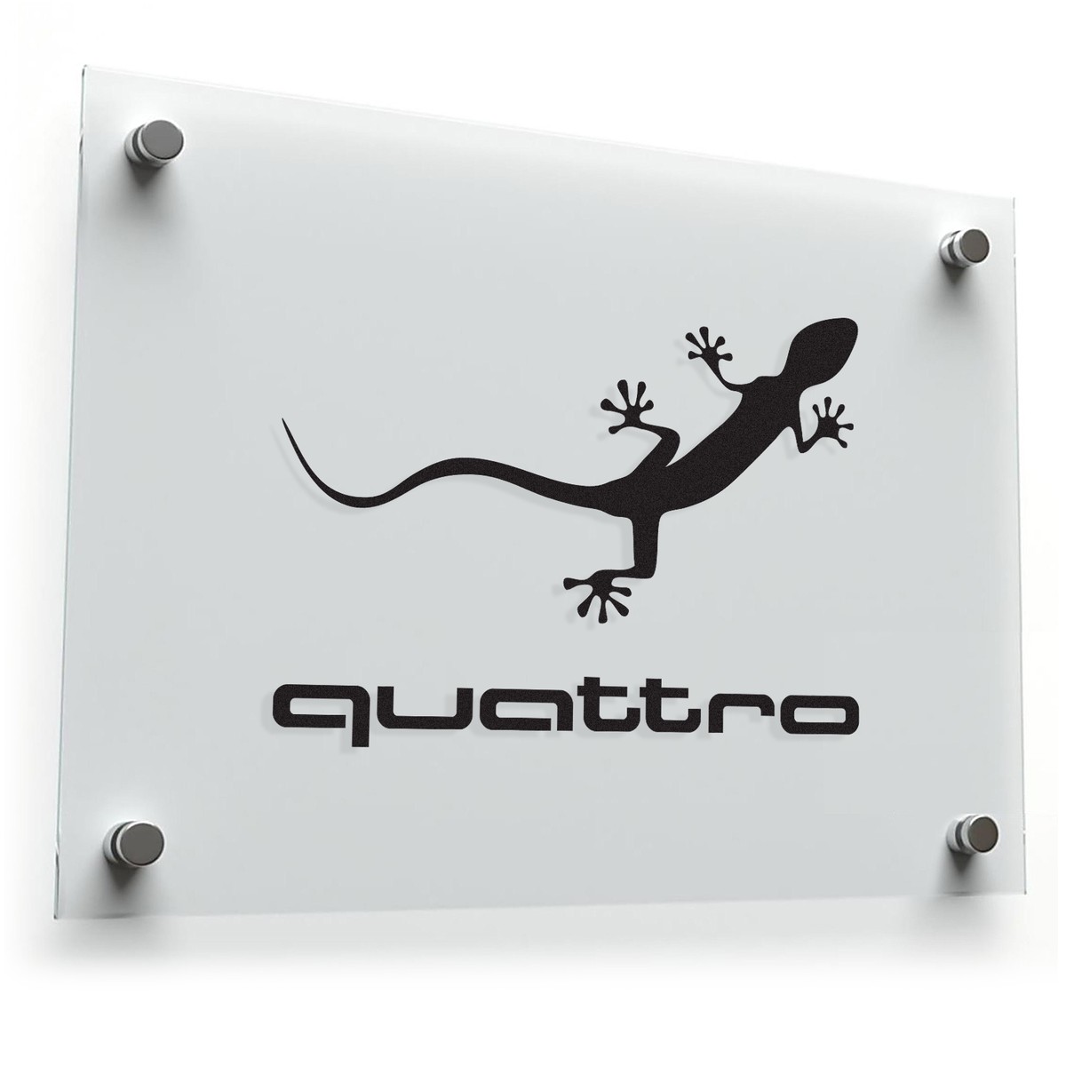 Rep your appreciation for Audi’s groundbreaking all-wheel-drive technology with this iconic Quattro sticker. This high-quality vinyl decal is a must-have for any Audi enthusiast, allowing you to personalize your belongings, including cars, laptops, water bottles, and more. The classic Audi Quattro logo, with its distinctive lettering and symbolizing enhanced traction and control, embodies the brand’s commitment to performance and innovation. The durable and weatherproof material ensures this sticker will last, allowing you to showcase your passion for driving excellence wherever you go. Available in multiple size options. The image features a black silhouette of a gecko, angled slightly upwards, positioned above the word “quattro” in a bold, sans-serif font. The gecko and the lettering are both solid black against a crisp white background, creating a clean and recognizable design.