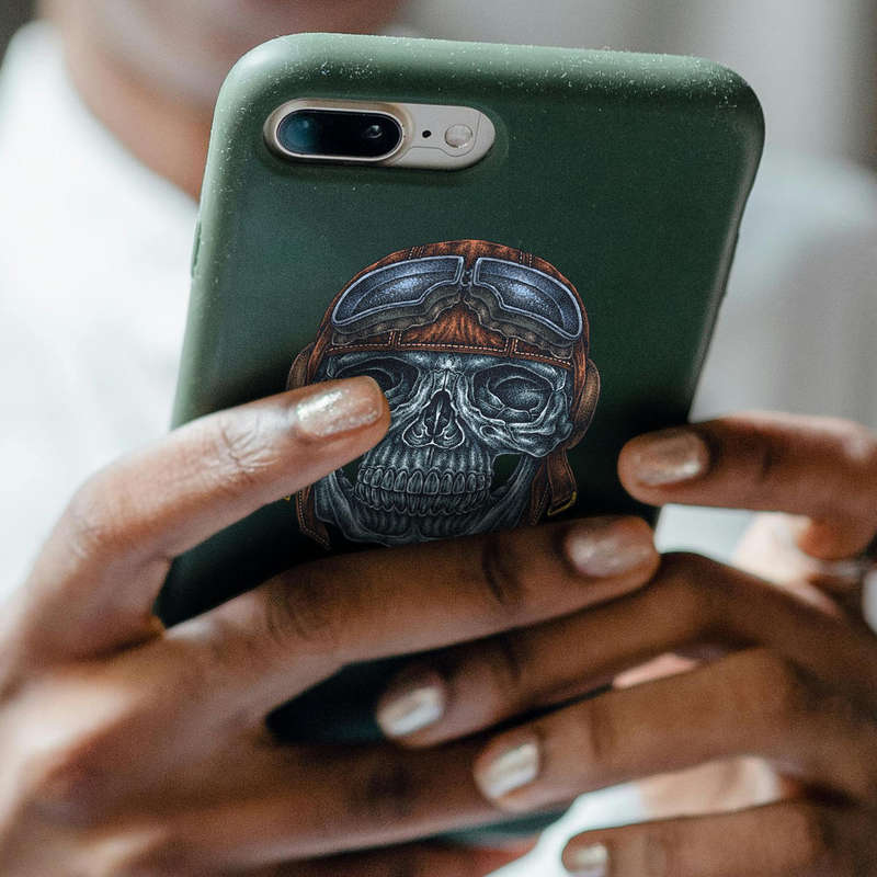 🎨 High-Detail Artwork: The intricate illustration highlights a detailed skull in shades of gray and blue, paired with a rich brown aviator helmet that pops on any background. 🎨