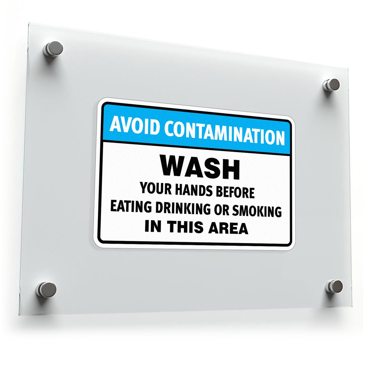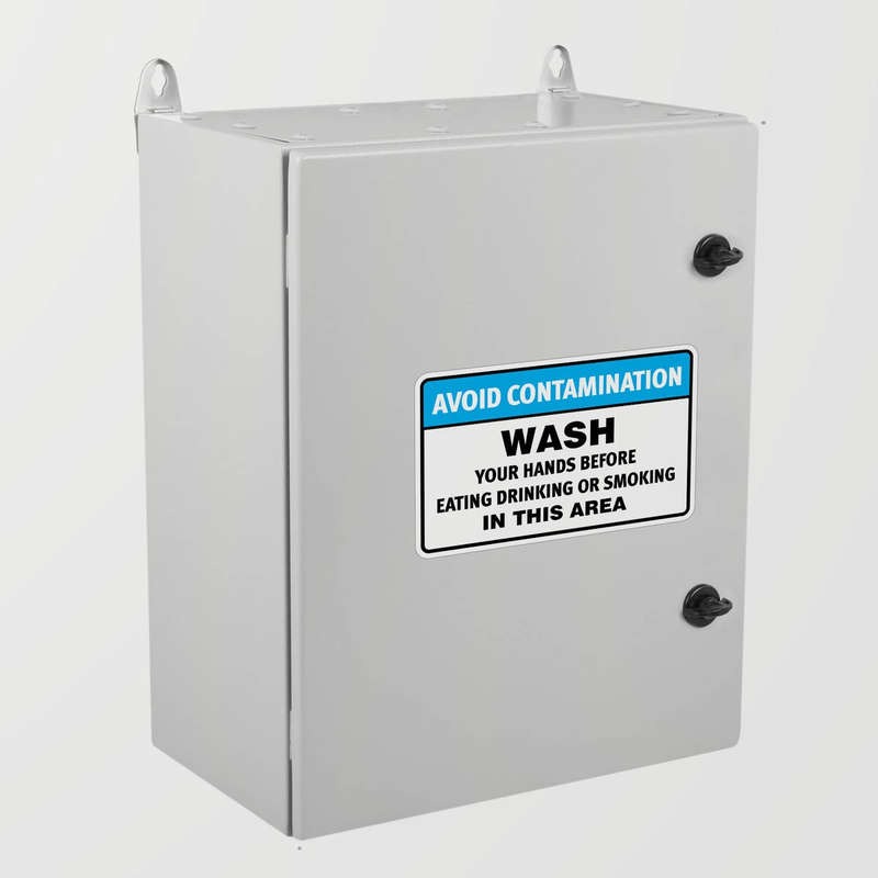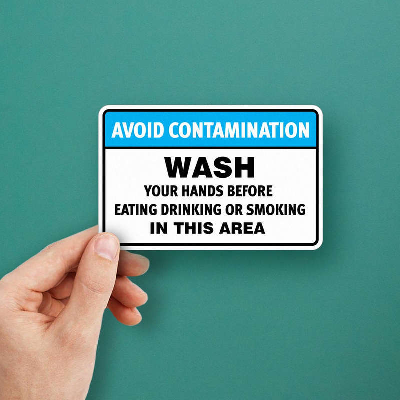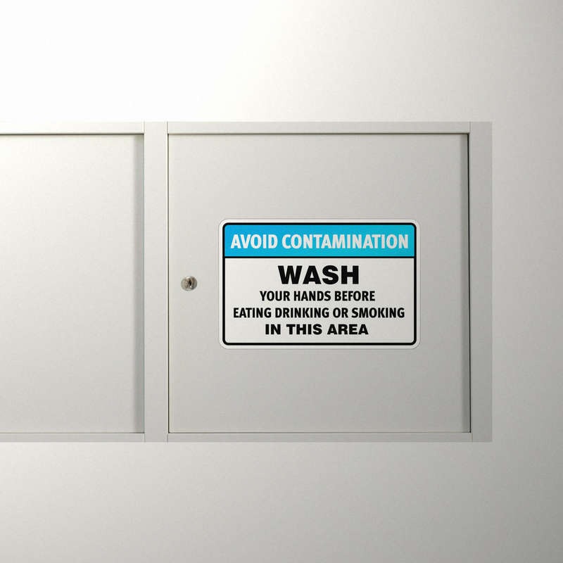 Encourage proper hygiene and safety practices in your workplace with this “Avoid Contamination – Wash Hands” sticker. Designed for industrial, food service, and other hygiene-sensitive environments, this durable vinyl decal promotes hand washing to prevent contamination. The bold text and high-visibility design ensure that employees are reminded to wash their hands before eating, drinking, or smoking. Easy to apply and built to last, this sticker is a must-have for any workplace prioritizing cleanliness and safety. Available in multiple sizes to suit your needs.