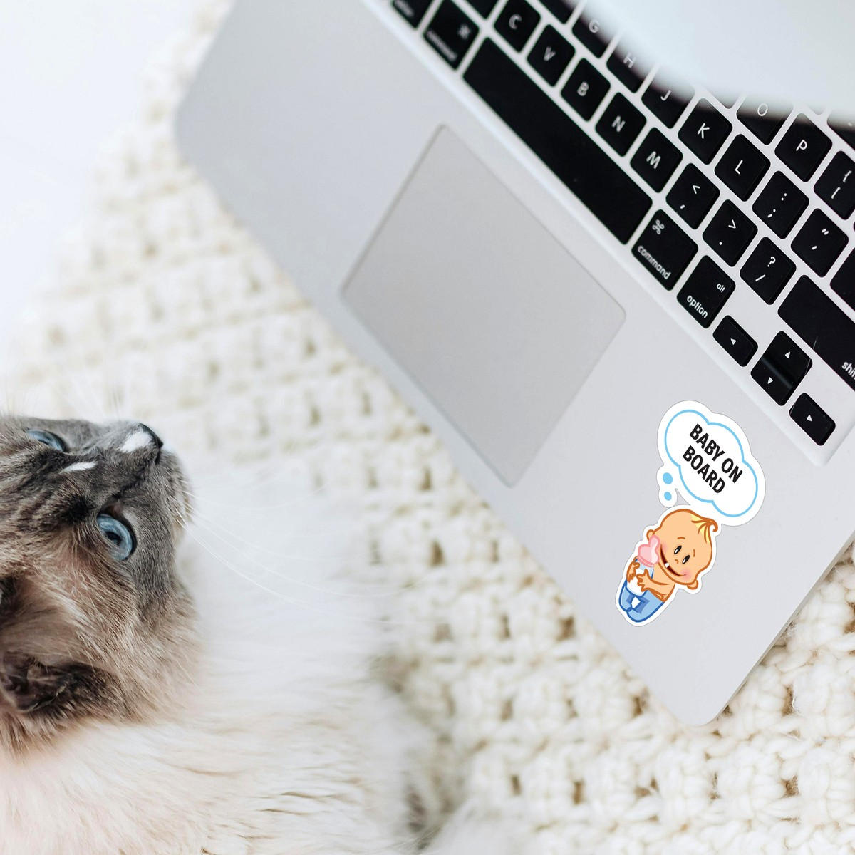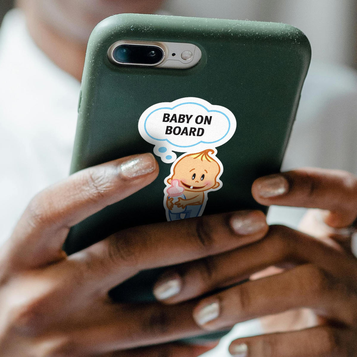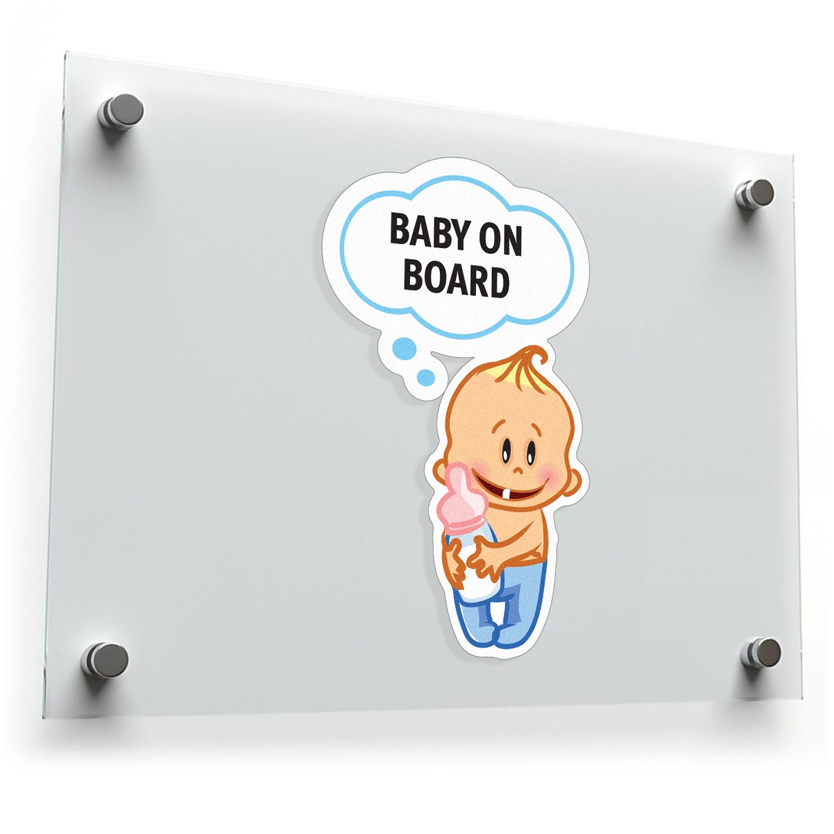 Drive safer with this “Baby on Board” sticker, featuring an adorable cartoon baby holding a bottle inside a playful thought bubble. Designed in cheerful blue and peach tones, this durable vinyl decal is weatherproof and fade-resistant, making it perfect for car windows, bumpers, or other surfaces. Its charming design not only adds a touch of fun but also effectively alerts other drivers to exercise caution, prioritizing your child’s safety on the road. Easy to apply and residue-free upon removal, this sticker offers both practicality and style for families. Available in multiple sizes to suit your vehicle’s needs.