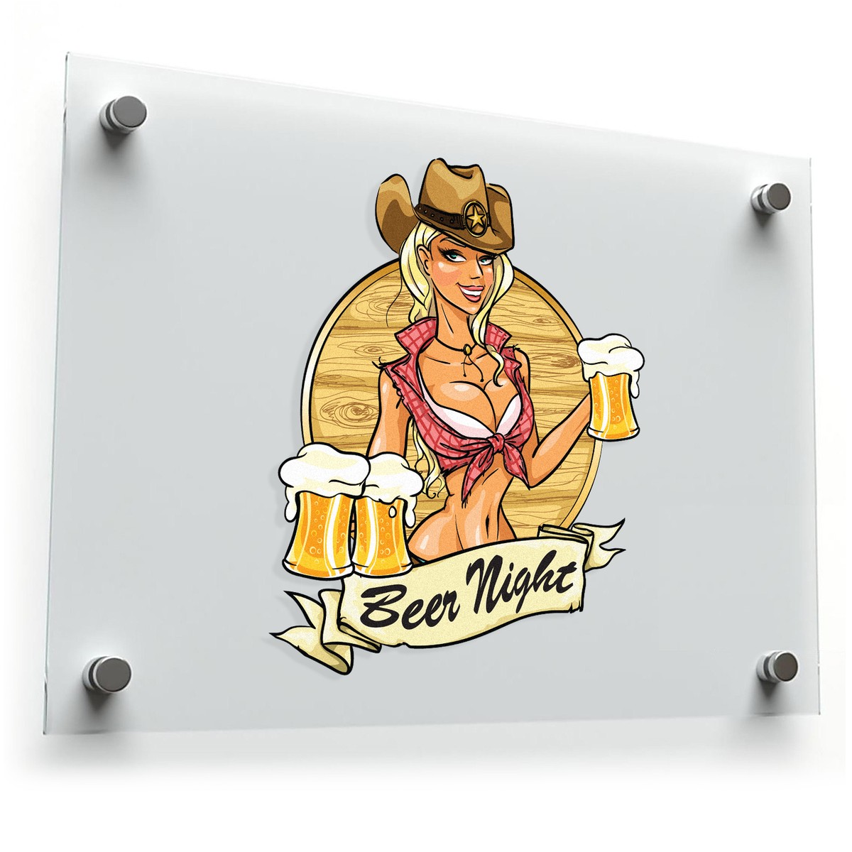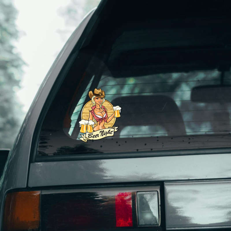 Beer Night Cowgirl Sticker 🍻 Fun Beer Night Design: This “Beer Night” cowgirl sticker adds a lively touch with a charming cowgirl holding frothy beer glasses – perfect for fans of western-themed decor and beer lovers alike. 🍻