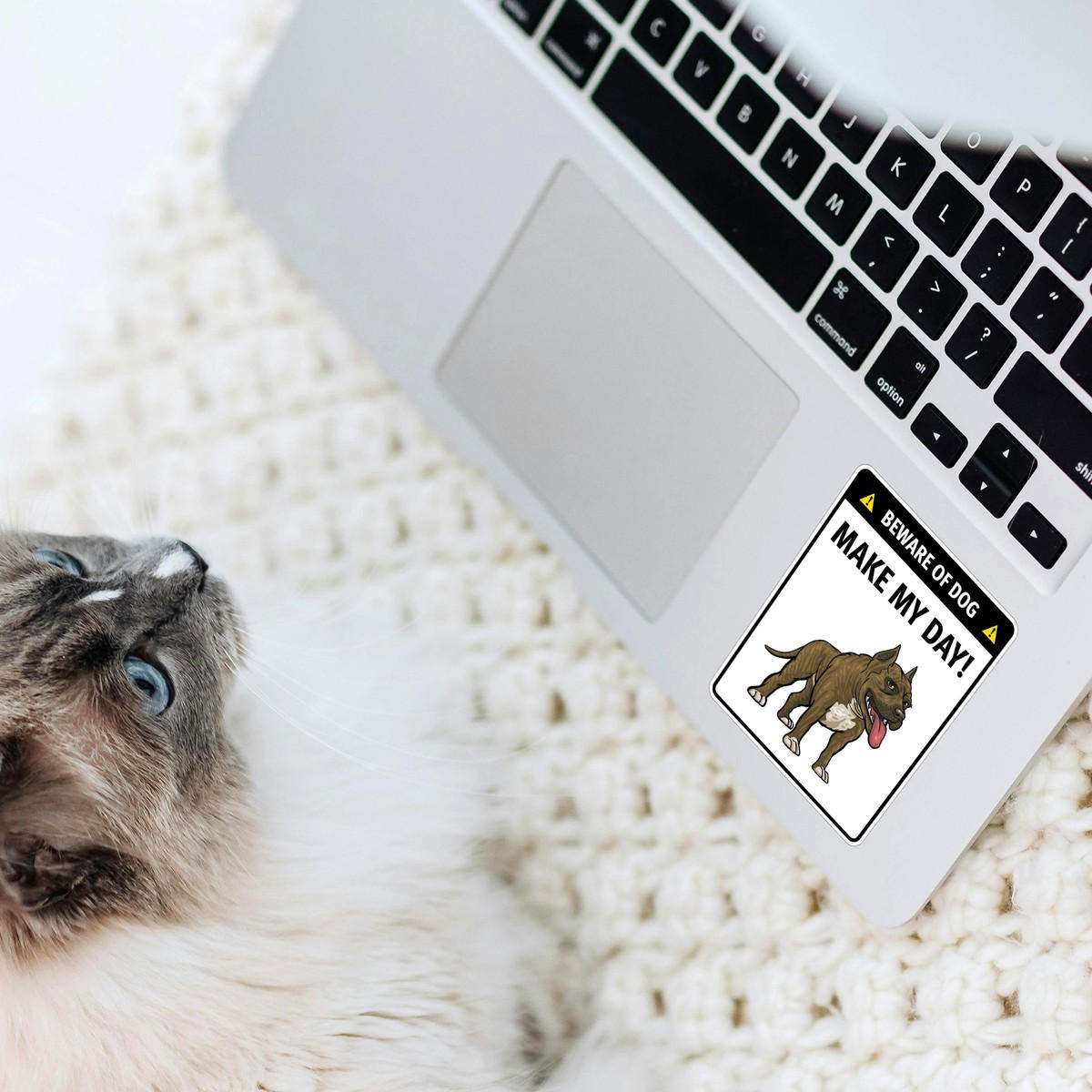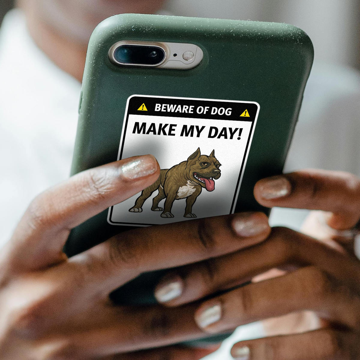 Enhance your home security with this bold “Beware of Dog – Make My Day” warning sticker. Featuring a fierce dog illustration and large, clear lettering, this decal is perfect for gates, fences, or windows to deter trespassers and protect your property. Made from durable, weatherproof vinyl, it is designed to withstand outdoor elements and maintain visibility over time. The easy peel-and-stick application ensures a quick and simple installation. Available in multiple sizes, this security sticker is the ideal addition to your home protection strategy, offering both peace of mind and a striking visual deterrent.