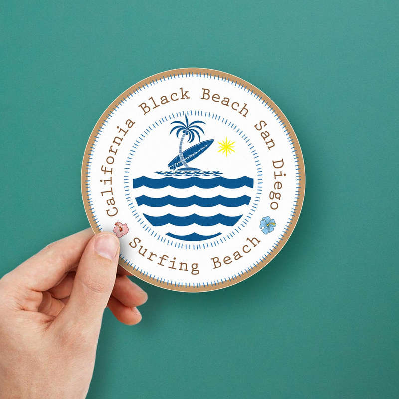 Celebrate the charm of California’s Black Beach in San Diego with this “Surfing Beach” vinyl sticker. Featuring a tropical design with a palm tree, surfboard, ocean waves, and hibiscus accents, this round decal captures the carefree essence of beach days. Made from durable, weatherproof vinyl, it resists fading and holds up beautifully in both indoor and outdoor settings. Easy to apply and remove without residue, it’s a perfect fit for cars, laptops, surfboards, or any smooth surface. Available in multiple sizes, this vibrant sticker is a stylish way to express your love for California’s surf culture and coastal beauty.