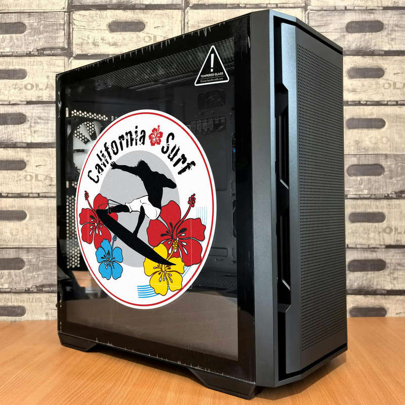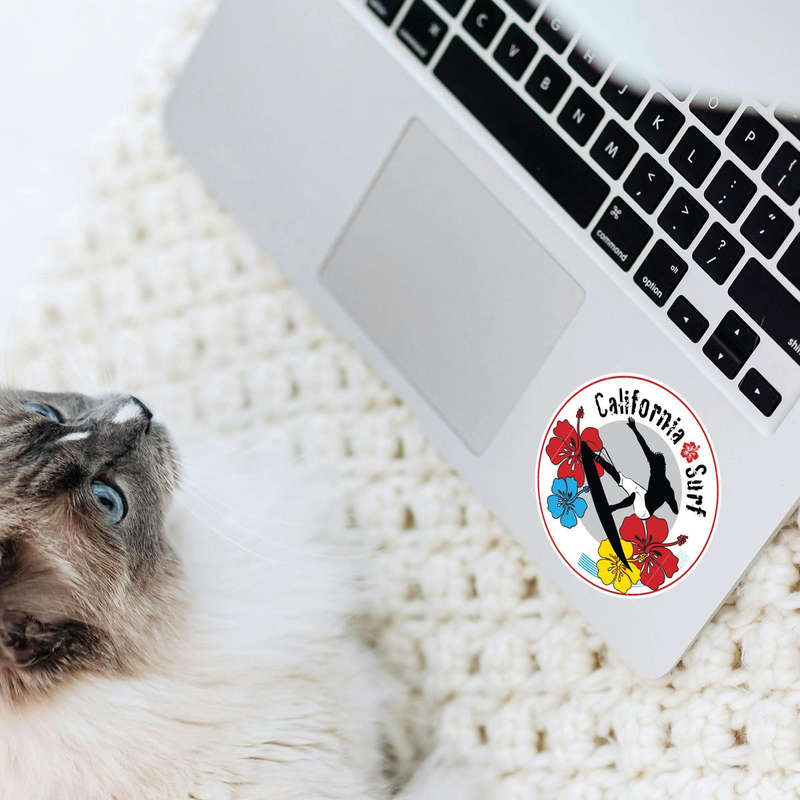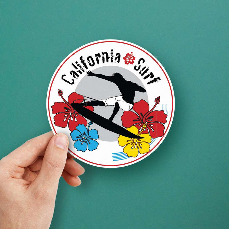 Capture the spirit of California surfing with this dynamic sticker, featuring a bold surfer silhouette in action, surrounded by vibrant red, blue, and yellow hibiscus flowers. The contrasting design pops on any surface, whether you’re decorating your car, laptop, or water bottle. Made from durable, waterproof vinyl, this sticker is built to last through outdoor adventures and beach trips. The easy application and residue-free removal make it perfect for personalizing your belongings with a fun, tropical vibe. Available in multiple size options, it’s a colorful reminder of the sun, surf, and sand wherever you go.
