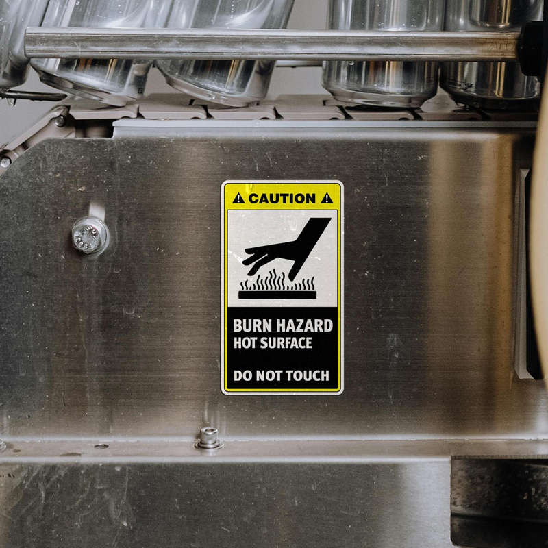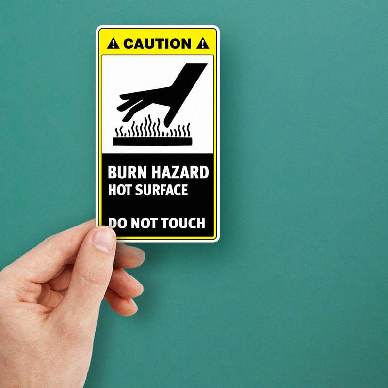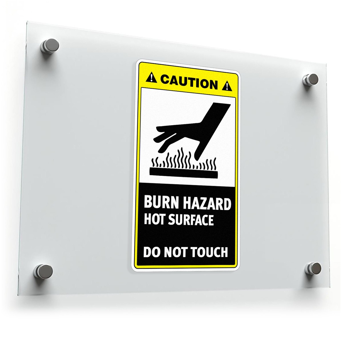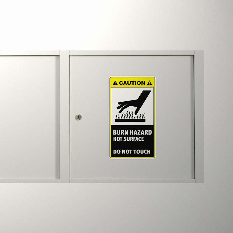 Enhance workplace safety with this “Caution: Burn Hazard Hot Surface” vinyl sticker. Featuring a bold yellow, black, and white design and a clear warning graphic, this sticker is essential for identifying hot surfaces and preventing burn accidents. Made from durable waterproof vinyl, it resists scratches, fading, and weather conditions, making it suitable for both indoor and outdoor applications. Ideal for placement on doors, walls, industrial equipment, or machinery, this safety decal provides a professional warning solution. Easy to apply and residue-free upon removal, it’s perfect for temporary or permanent use. Available in multiple sizes, this sticker is a must-have for ensuring safety compliance.