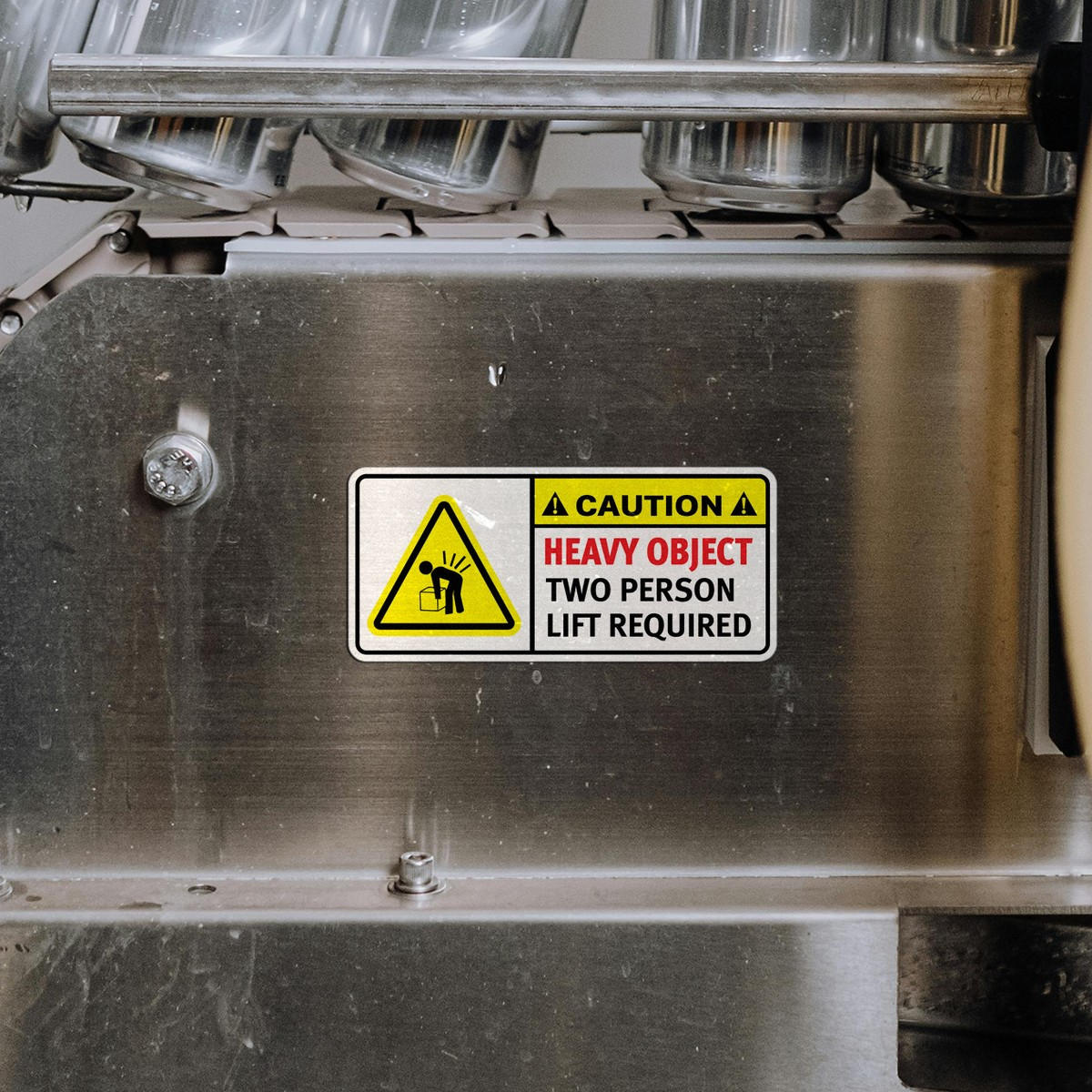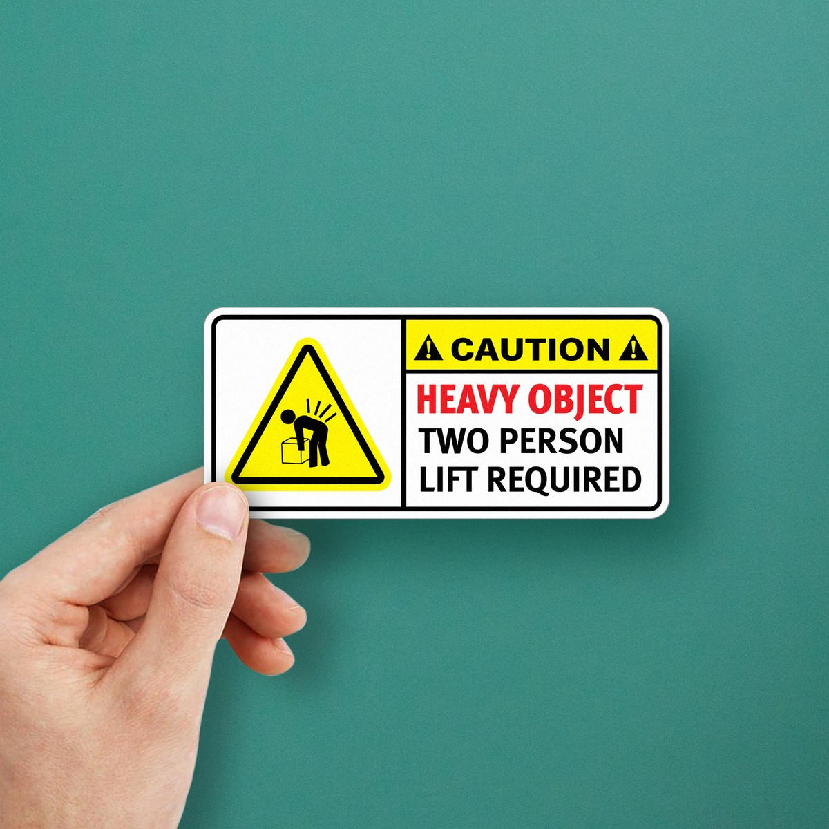 Ensure workplace safety with this “Caution: Heavy Object, Two Person Lift Required” warning sticker. Measuring 10×4 inches, this high-visibility decal is made from durable, weatherproof vinyl, ensuring it holds up in both indoor and outdoor environments. The bold text and clear warning symbols provide an immediate visual reminder, helping to prevent lifting injuries and promote safety compliance. Easy to apply on various surfaces, this sticker is perfect for warehouses, factories, and industrial spaces. Available in multiple sizes to suit your specific safety needs.