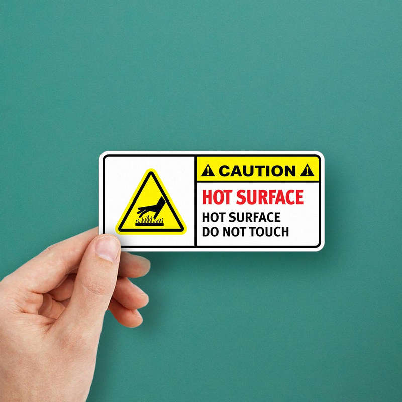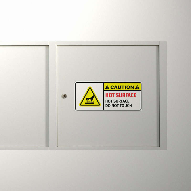 Protect your workplace with this “Caution Hot Surface” sign sticker, designed to warn individuals of potential burn hazards. Featuring high-visibility text and symbols, this decal is ideal for industrial settings such as factories, kitchens, and labs where hot surfaces pose a risk. Made from durable, weatherproof vinyl, this warning sticker withstands both indoor and outdoor conditions, ensuring it remains effective over time. Available in multiple sizes to suit various applications, it’s easy to apply and remove without leaving sticky residue, offering a practical and professional safety solution.