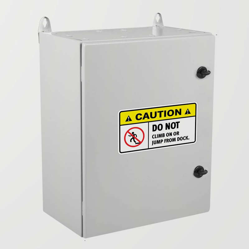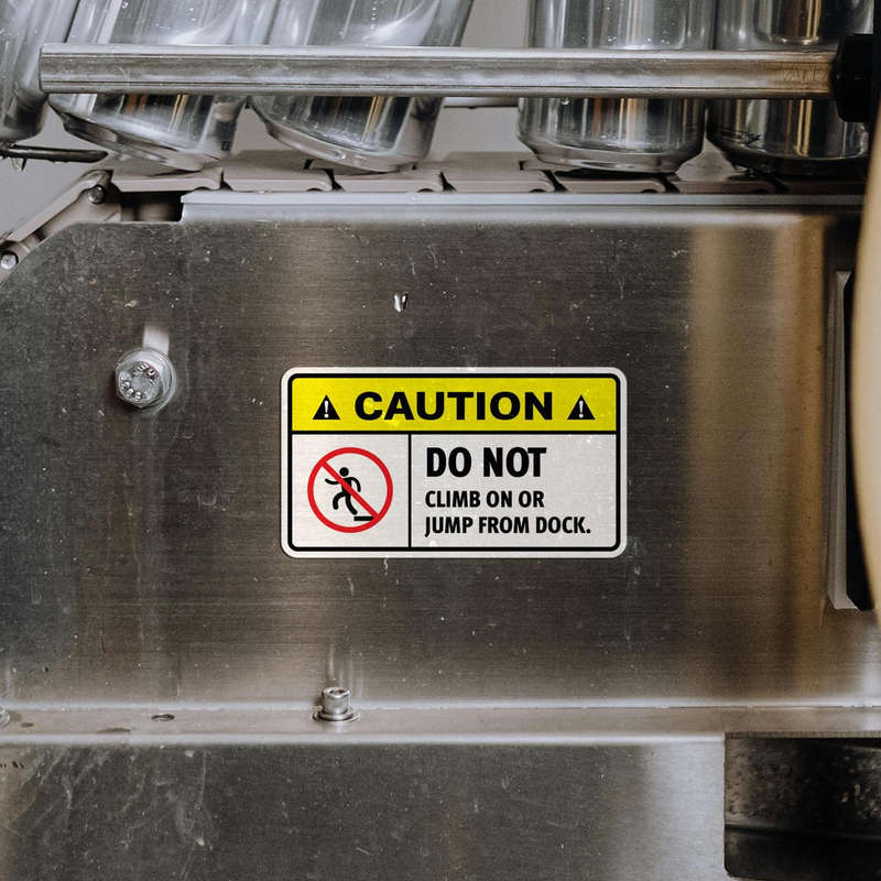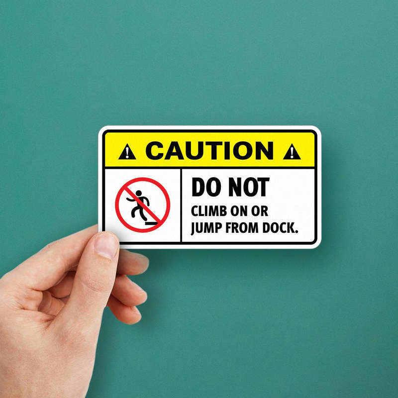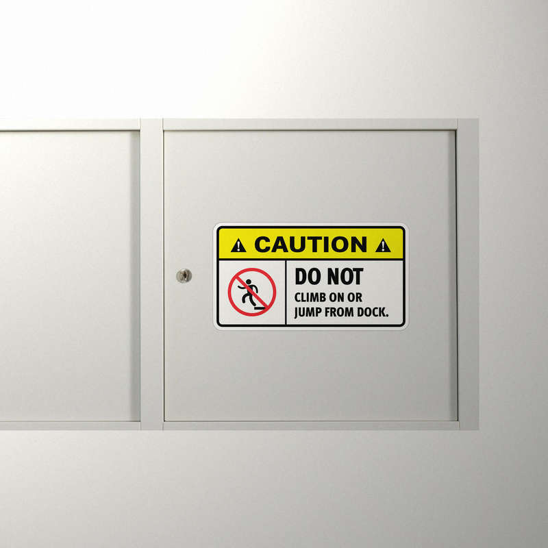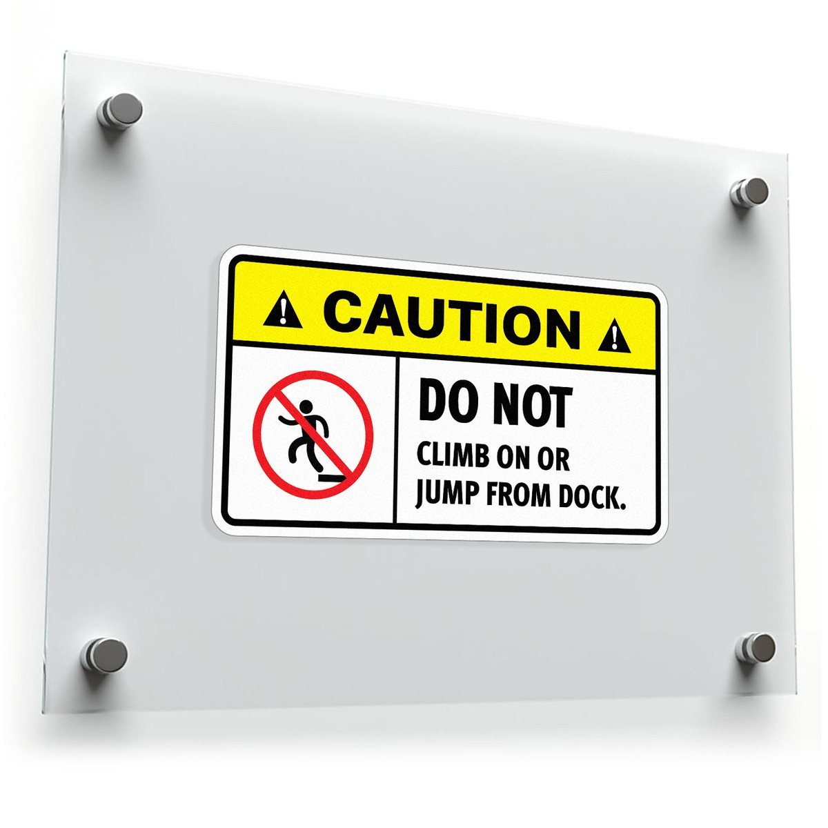 Ensure safety around docks and water areas with this durable “Do Not Climb or Jump from Dock” caution sign decal. With its bold yellow and black design, accented by clear symbols, this sticker delivers a highly visible message, reminding people of safety protocols. Crafted from long-lasting vinyl, it withstands various weather conditions, making it suitable for outdoor use in marinas, water parks, and residential docks. Its simple application process and residue-free removal make it versatile and practical for any high-traffic area. Available in multiple size options, this decal is essential for promoting safe practices around water.