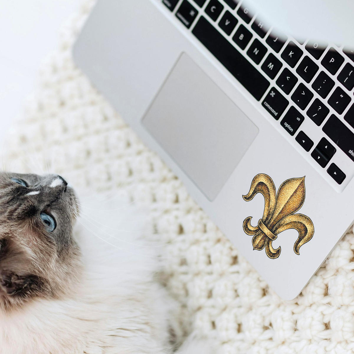 Elevate your decor with this classic fleur-de-lis sticker, featuring a luxurious gold design. Perfect for home decor, cars, laptops, or even walls, this vinyl decal adds a touch of elegance and sophistication to any surface. Made from durable, weatherproof vinyl, it ensures long-lasting beauty whether used indoors or outdoors. The easy-to-apply and remove design allows for flexibility, leaving no residue behind. Available in multiple size options, this timeless fleur-de-lis decal is perfect for those seeking to incorporate a refined and classic touch into their personal space.