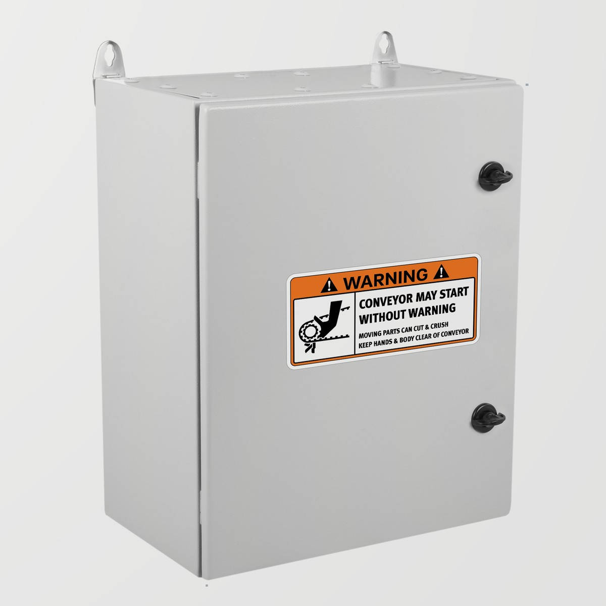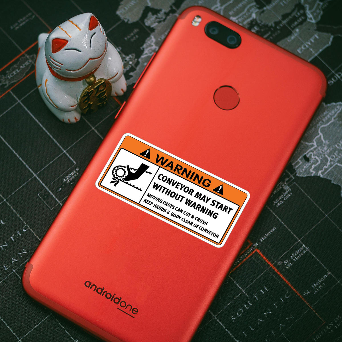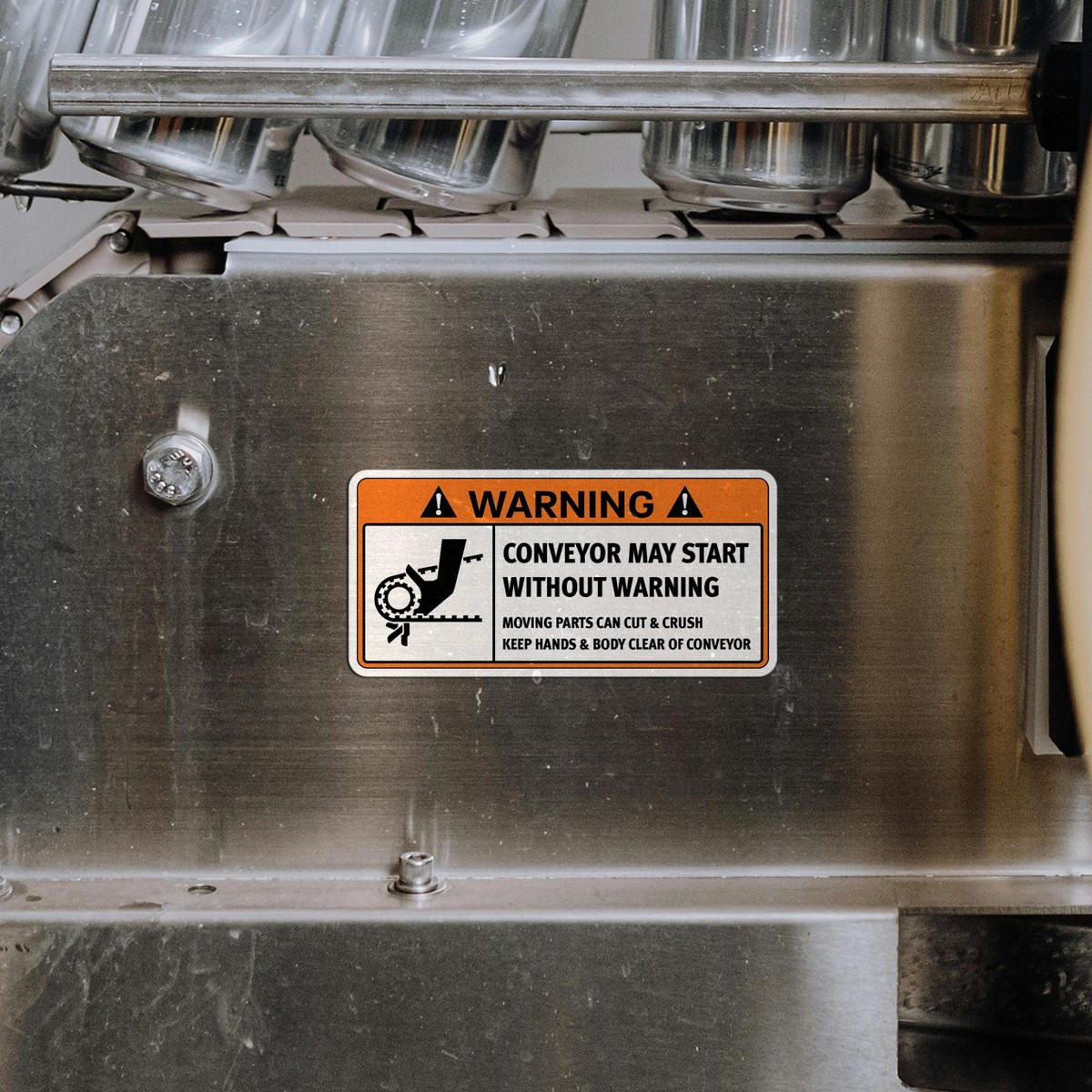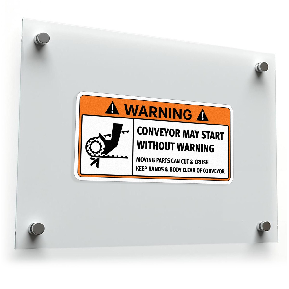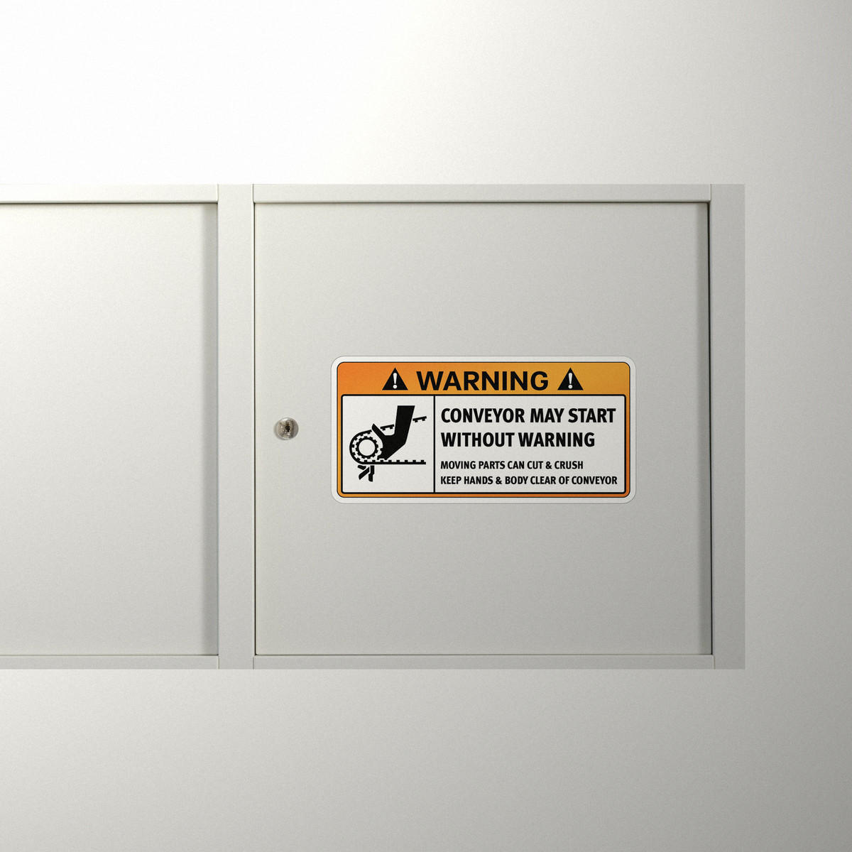 Ensure workplace safety with this “Conveyor May Start Without Warning” safety sticker. Designed for use in industrial environments such as factories and warehouses, this bold vinyl decal communicates essential safety information, helping to prevent accidents. The durable construction ensures it withstands harsh conditions while remaining easy to remove without residue. The high-visibility orange and black design ensures the warning is clear and noticeable, keeping workers informed of potential hazards. Available in multiple sizes, this safety sign can be placed on conveyor systems, walls, or doors to ensure maximum safety compliance.
