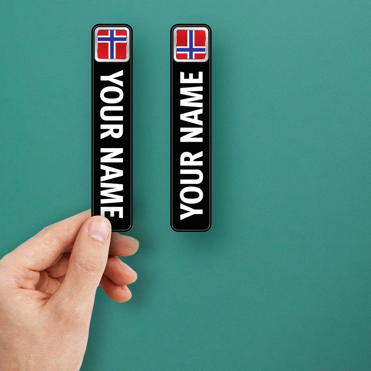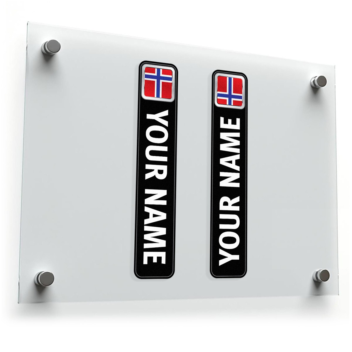 Show your Norwegian pride with these custom name stickers featuring bold white text on a sleek black background with the vibrant red, white, and blue Norwegian flag design. Perfect for personalizing laptops, cars, water bottles, or sports gear, these decals add a unique and stylish touch to your belongings. Crafted from durable, waterproof vinyl, they resist fading and wear, ensuring long-lasting use indoors or outdoors. The easy-to-apply and residue-free removal design ensures a hassle-free experience. Available in multiple sizes, these personalized stickers are ideal for adding a touch of Norwegian flair to your items.