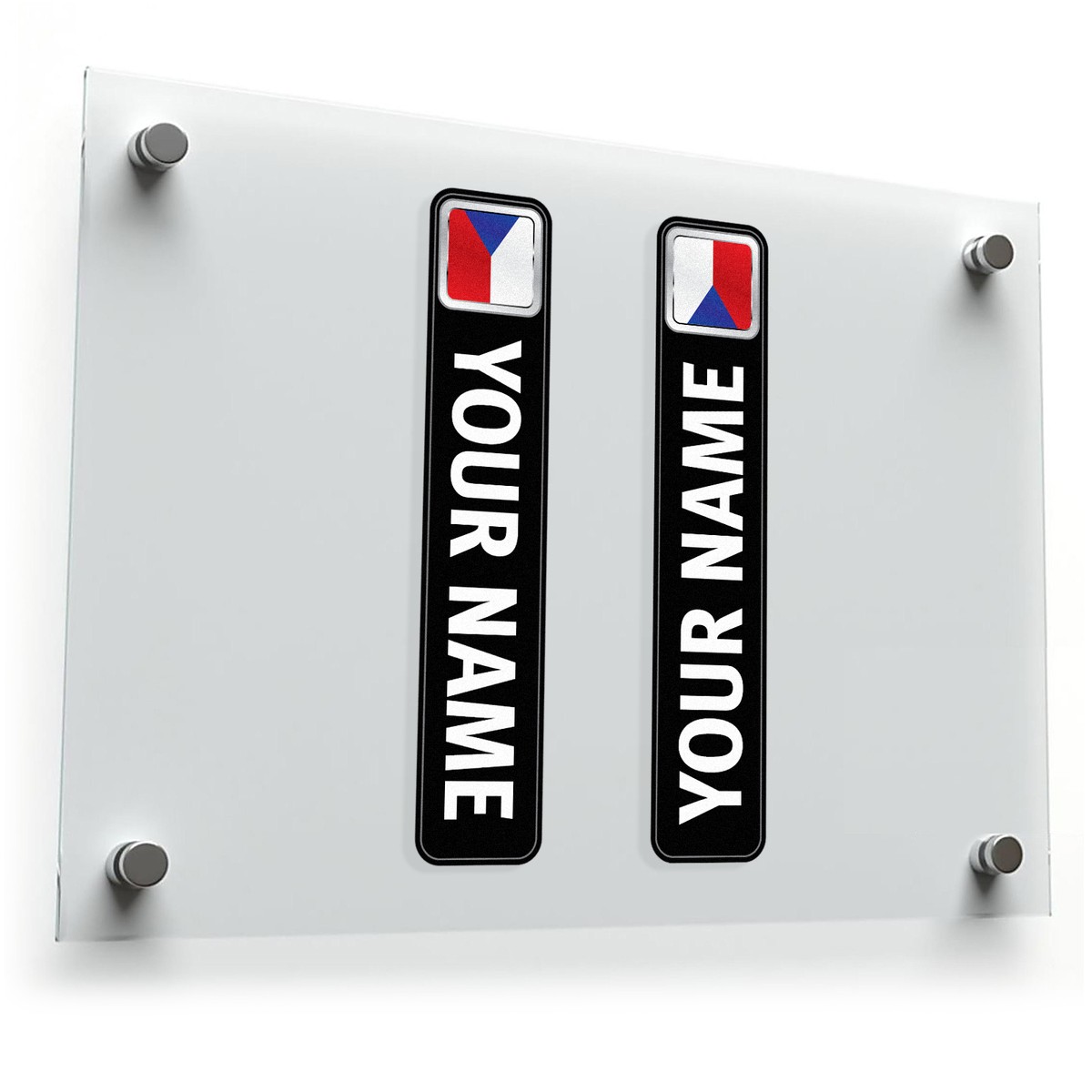 Celebrate your Czech pride or personalize your items with this set of customizable name plate stickers. Featuring a bold black background, clean white text, and the Czech flag, these decals combine style and individuality. Perfect for cars, lockers, or personal belongings, these vinyl stickers are waterproof, UV-resistant, and fade-proof, making them suitable for indoor and outdoor use. The easy-to-apply design ensures a hassle-free experience, while clean removal leaves no residue. Whether as a personal accessory or a meaningful gift, these nameplate stickers are a stylish and practical way to showcase your heritage. Available in multiple sizes to suit your needs.