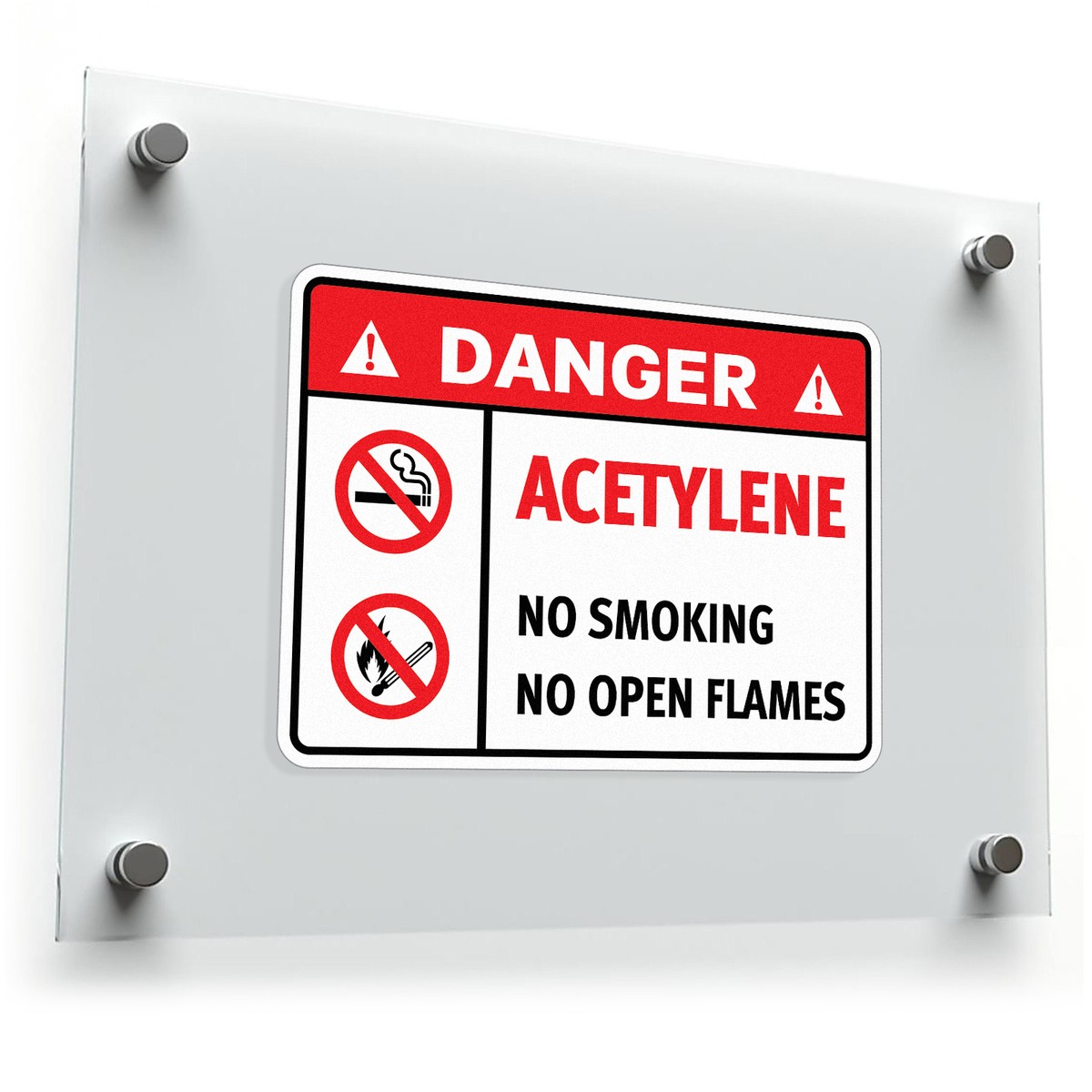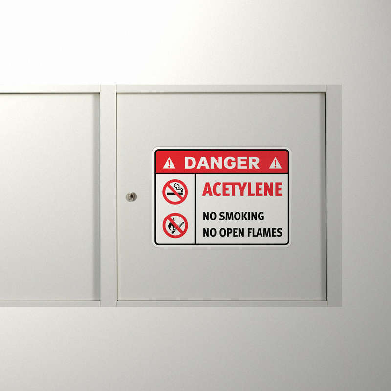 Enhance safety in acetylene storage and handling areas with this “Danger Acetylene No Smoking No Open Flames” sticker, designed to warn of fire risks associated with flammable gas. Featuring clear red and black text with no-smoking and no-flame symbols, this sticker ensures high visibility, making safety protocols easy to understand. Made from durable, weather-resistant material, it holds up well in industrial environments, providing long-lasting reliability. Simple to apply on walls, doors, or gas tanks, this sticker is an essential tool for maintaining compliance and preventing accidents in hazardous areas. Available in multiple sizes to fit various safety needs.