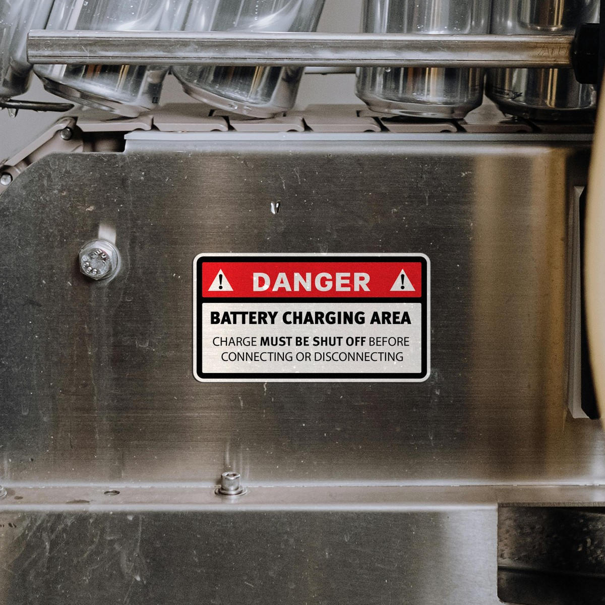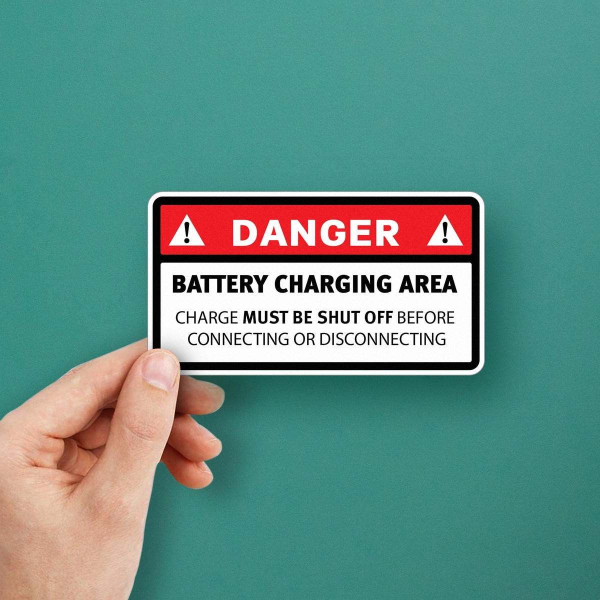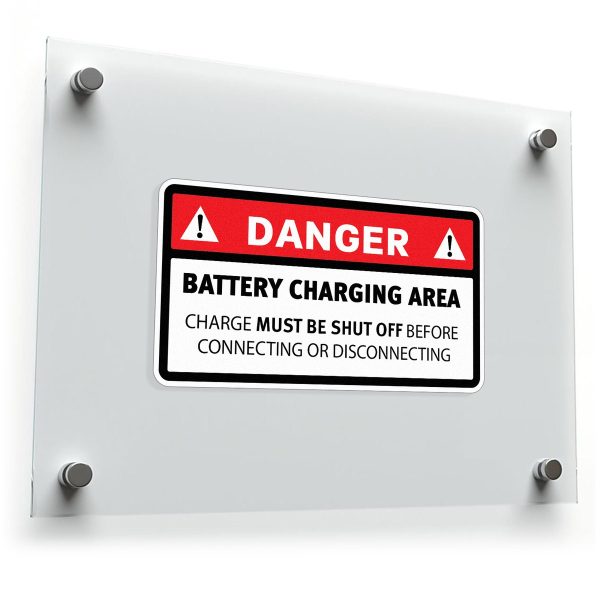 Ensure safety in your workplace with this “Danger: Battery Charging Area” sticker, designed to clearly remind workers to shut off the charge before connecting or disconnecting. Made from durable vinyl, this decal is resistant to water, wear, and fading, ensuring long-lasting visibility even in industrial environments. Its bright red and black design is easy to spot, helping to reinforce safety protocols and prevent accidents. With a strong adhesive backing, it can be applied to battery rooms, charging stations, or machinery, promoting safety and compliance in critical areas. Available in multiple sizes to fit your needs.