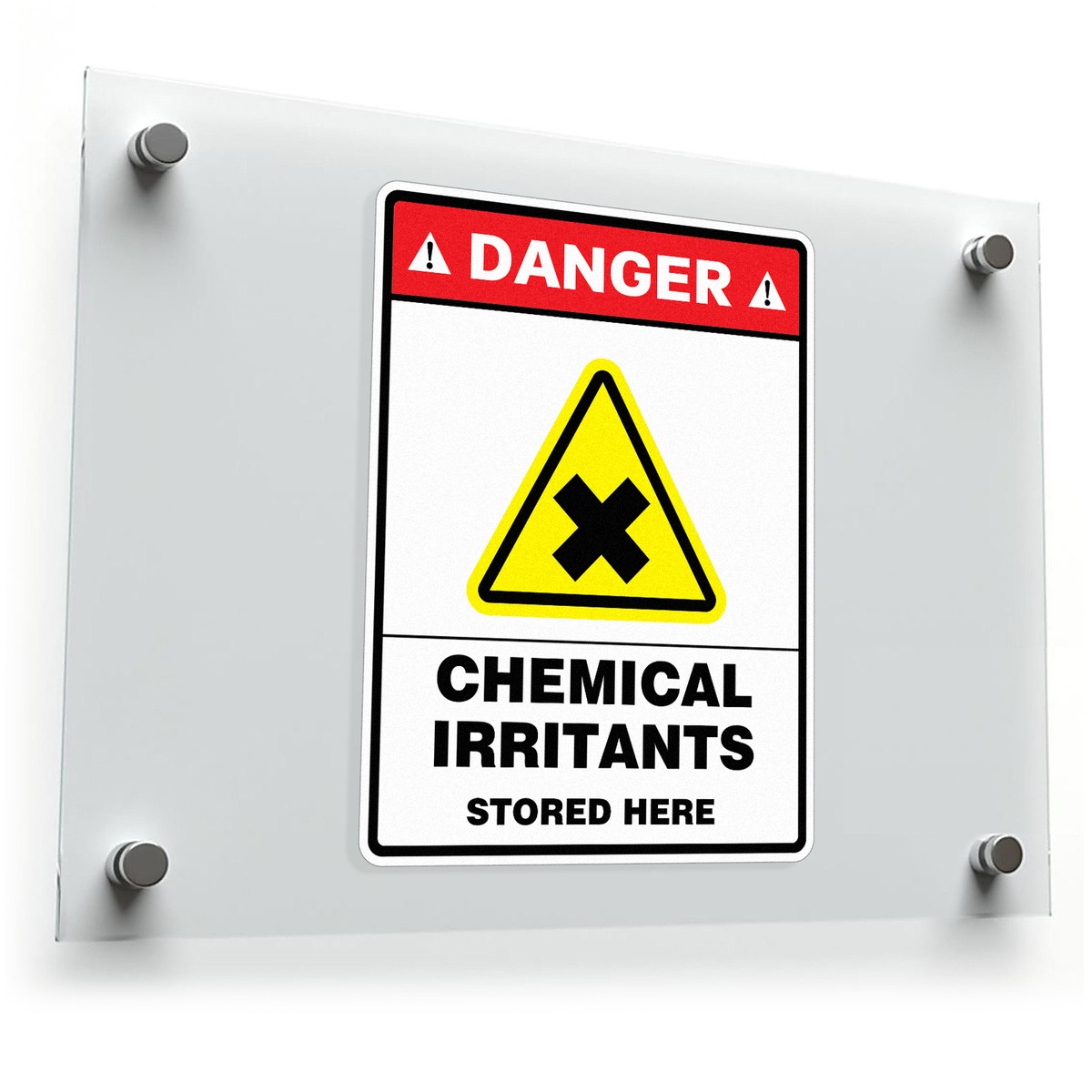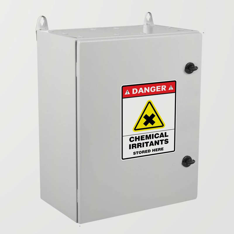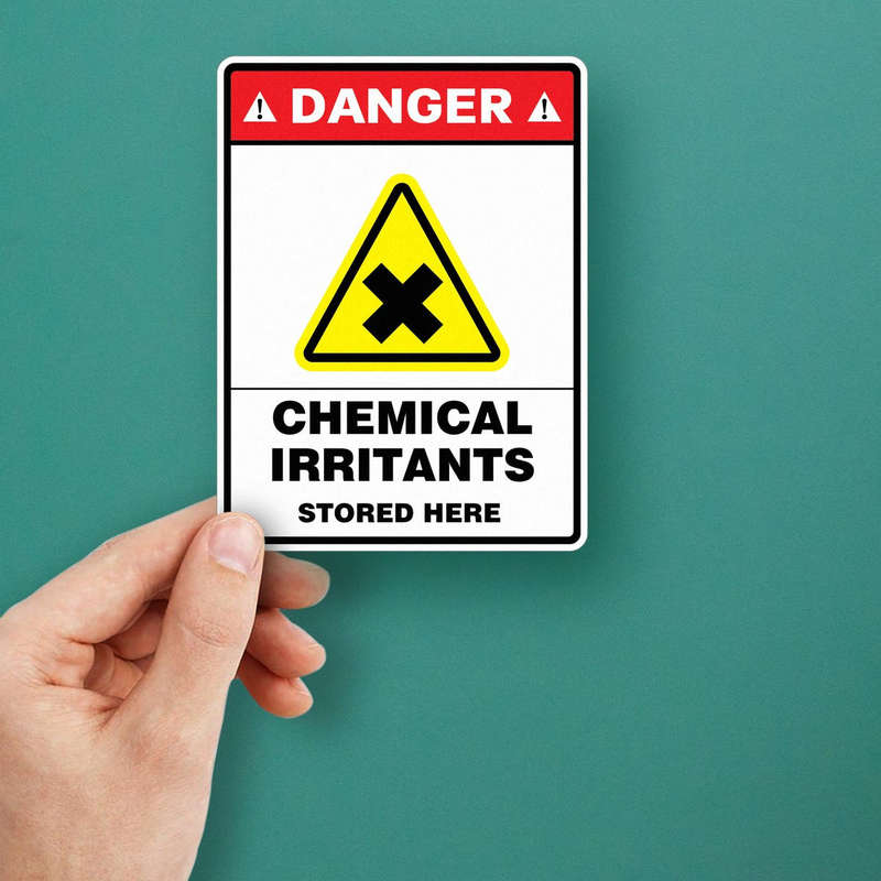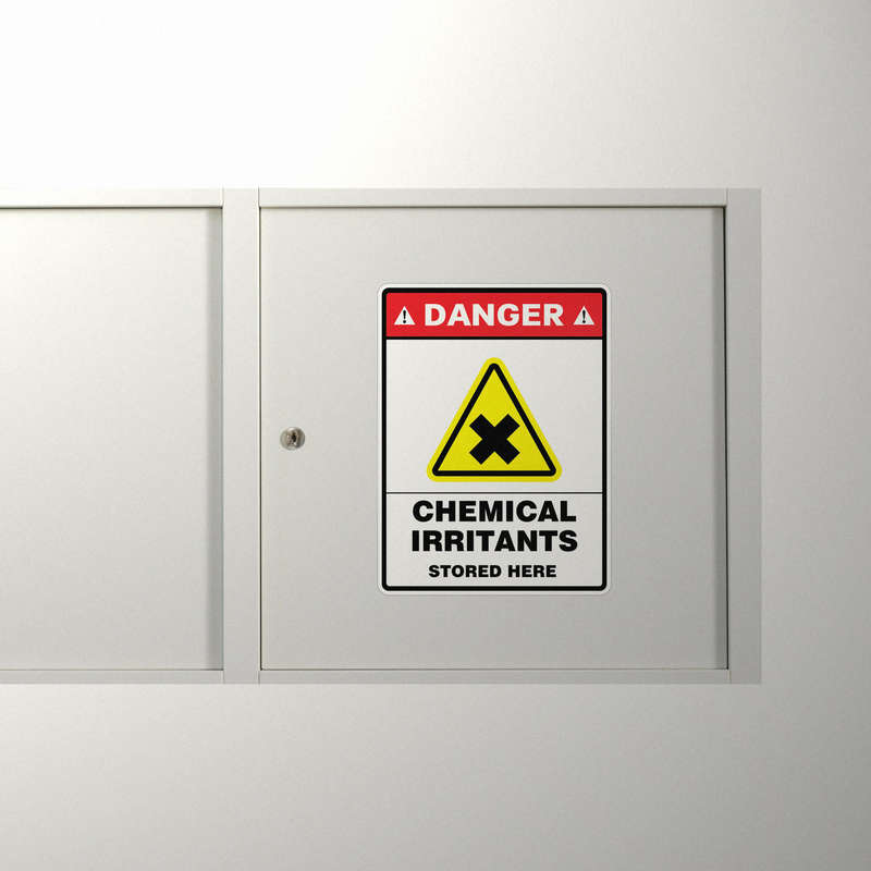 Ensure workplace safety with this “Danger – Chemical Irritants Stored Here” warning sticker. Featuring a bold red header, black and yellow irritant symbol, and clear text, this vinyl decal provides a strong visual reminder to exercise caution around hazardous materials. Perfect for laboratories, chemical storage rooms, and industrial facilities, it helps promote safety compliance and hazard awareness. Made from durable, weatherproof vinyl, it resists fading, peeling, and exposure to harsh environments, making it ideal for indoor and outdoor use. Easy to apply to flat surfaces, this sticker is a vital tool for any safety-conscious workspace.