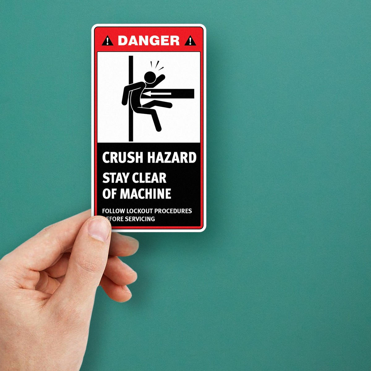 Danger Crush Hazard Sticker ⚠️ Clear Hazard Warning: This “Crush Hazard” sticker provides a highly visible warning to stay clear of dangerous machinery, promoting workplace safety. ⚠️