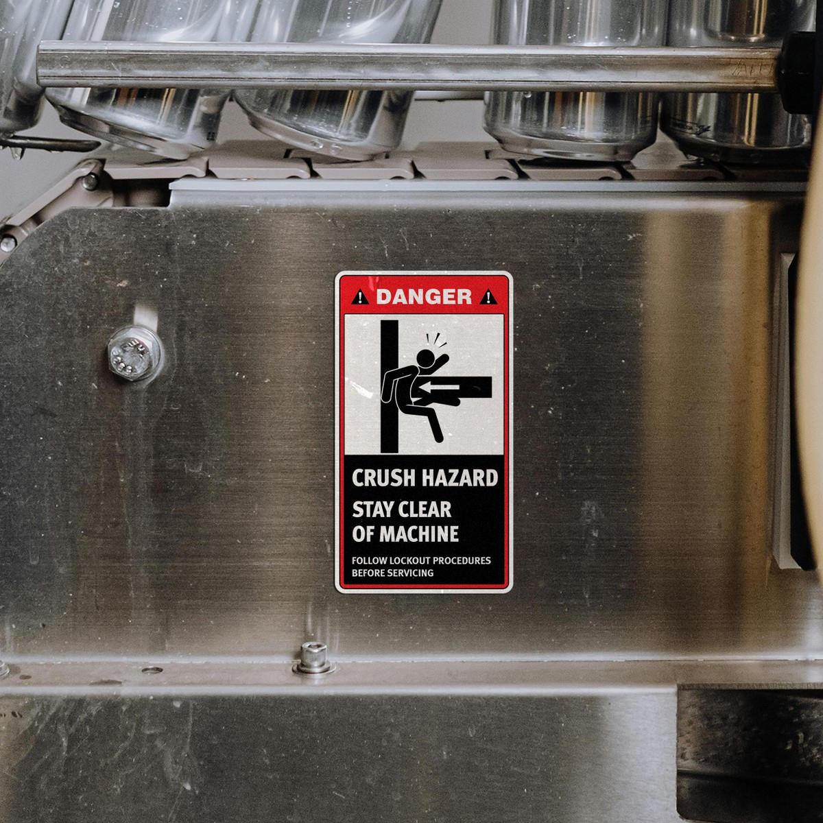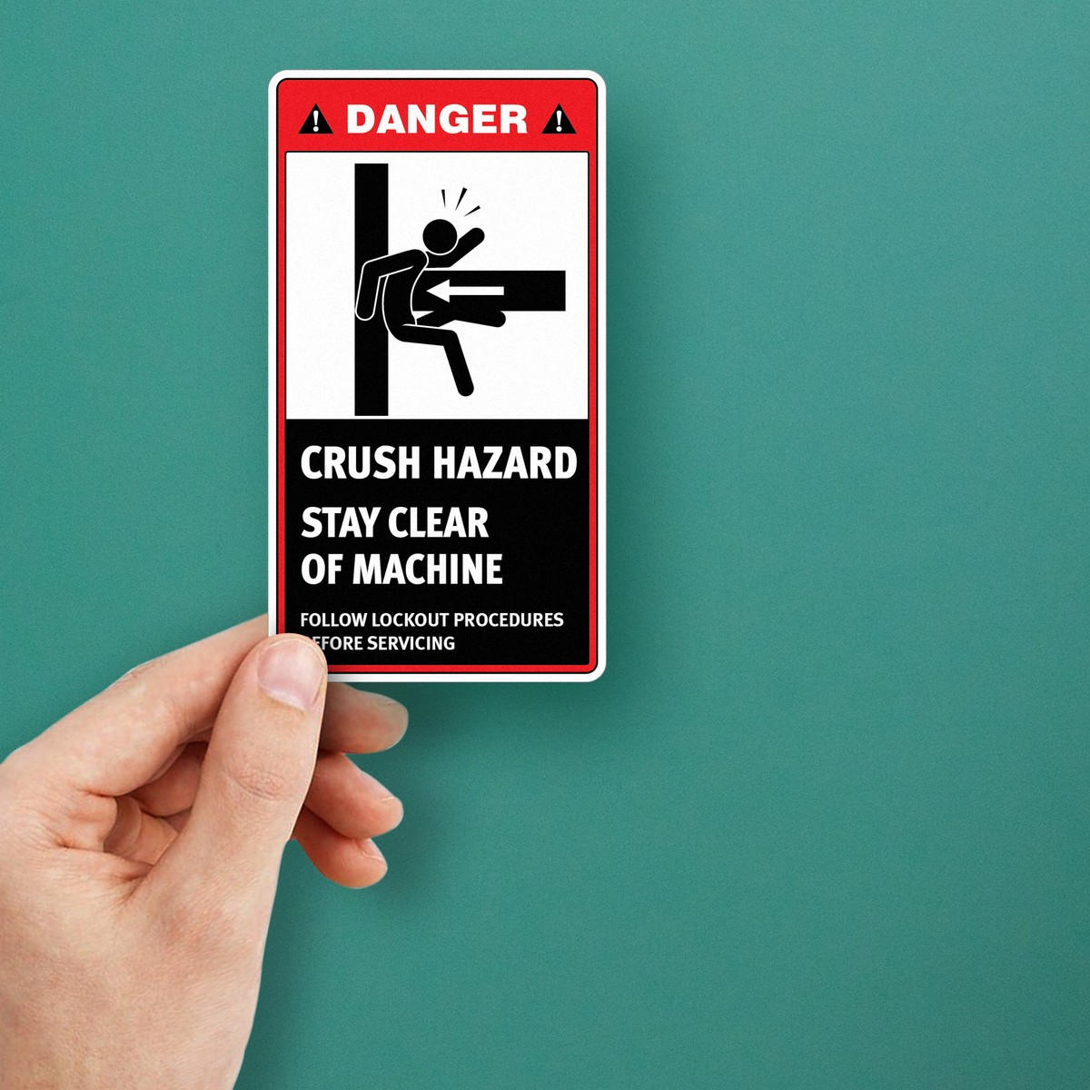 Promote a safer work environment with this bold “Danger: Crush Hazard” safety sticker. Made from durable, industrial-grade vinyl, this decal withstands tough conditions, making it perfect for machines and equipment in factories, warehouses, and industrial sites. Its easy-to-apply adhesive ensures it stays firmly in place, while the clear, bold design and warning icons help prevent accidents. The sign reminds workers to stay clear of hazardous areas and follow lockout procedures before servicing. Available in multiple sizes, this sticker is a vital addition to any workplace safety protocol.