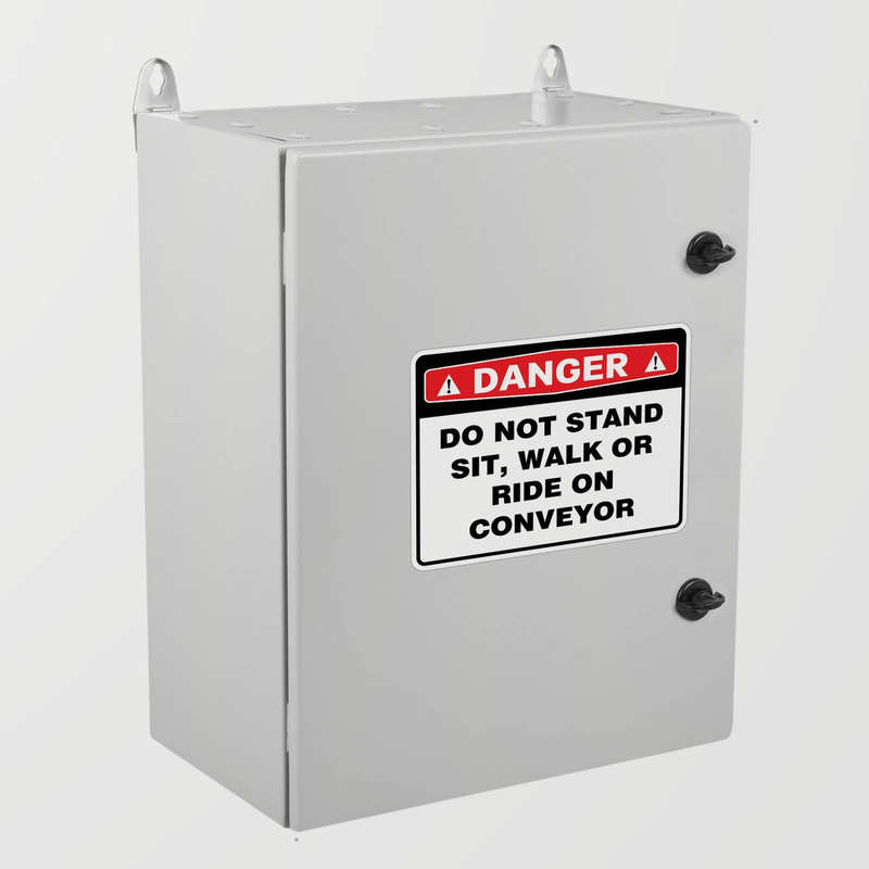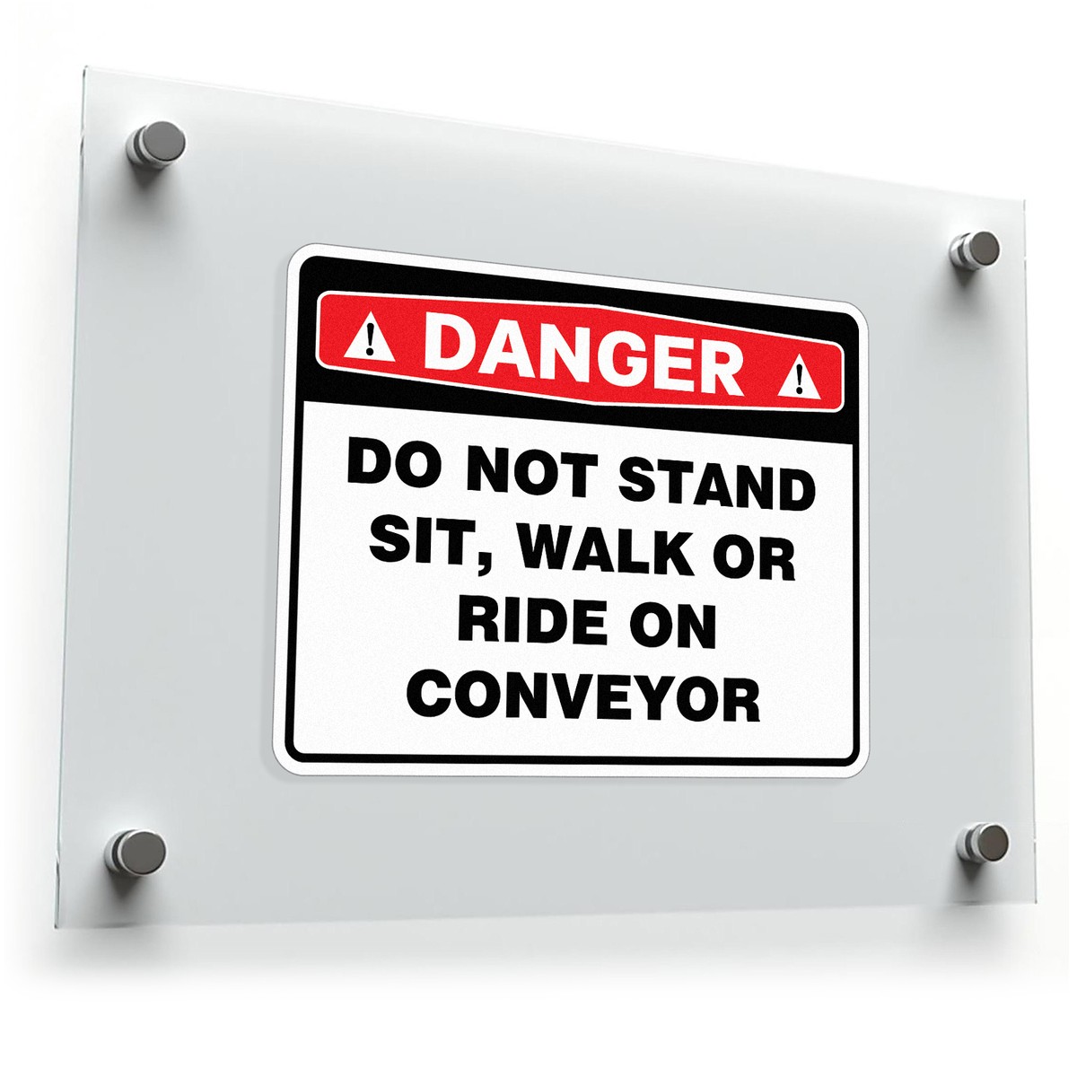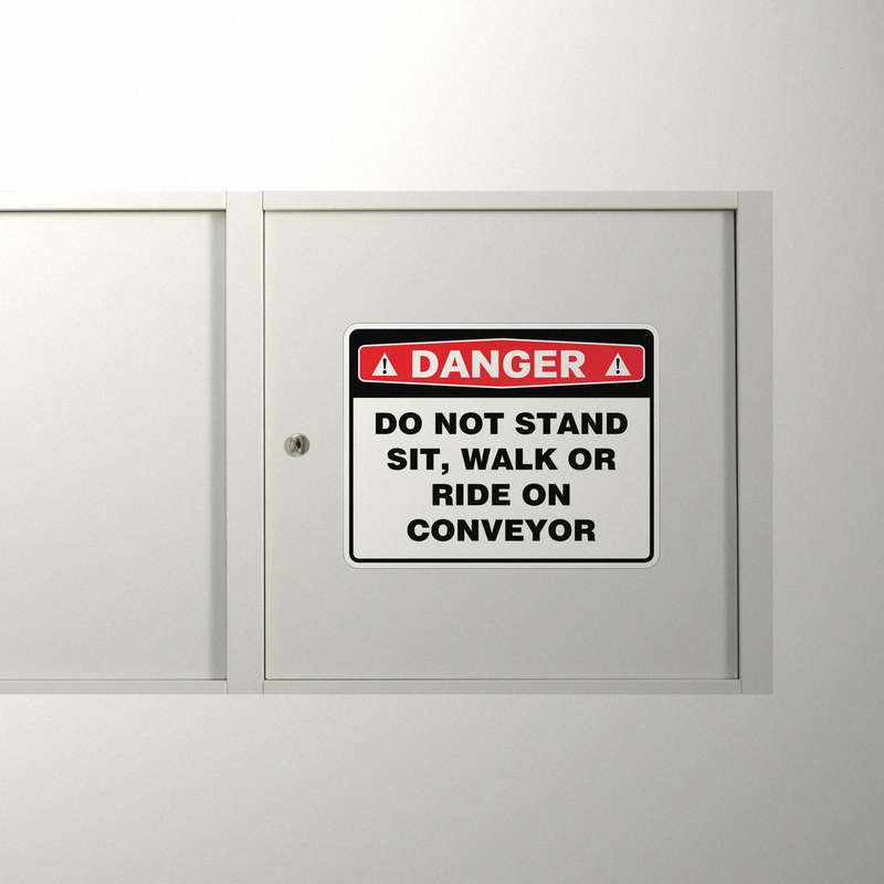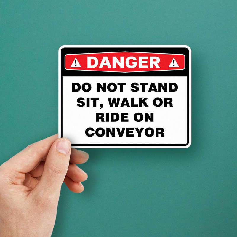 Ensure workplace safety with this “Danger: Do Not Stand, Sit, Walk, or Ride on Conveyor” warning sticker. Its high-visibility design in bold red, black, and white colors captures attention, clearly alerting personnel to avoid dangerous behavior around conveyor systems. Crafted from durable, weather-resistant materials, this decal is suitable for both indoor and outdoor use on conveyors and other equipment. With a strong adhesive backing, it attaches securely to various surfaces, offering a lasting safety reminder in high-traffic industrial environments. Available in multiple sizes, this decal is essential for promoting safety and compliance in workplaces with conveyor equipment.