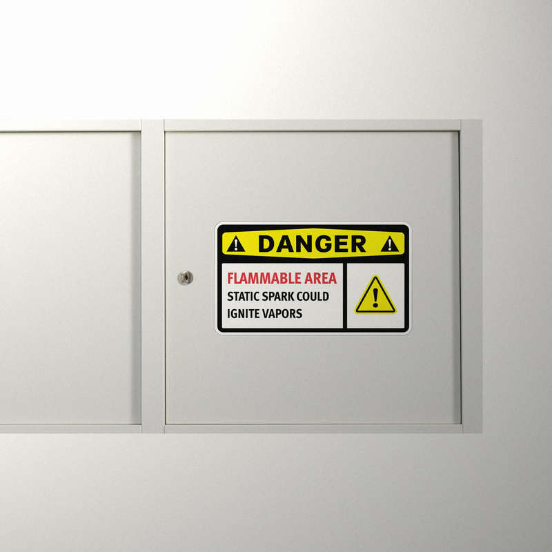 Ensure workplace safety with this high-visibility “Danger Flammable Area” sticker. Featuring a bold combination of red, yellow, black, and white, the decal draws immediate attention and delivers a critical warning: “Static Spark Could Ignite Vapors.” Crafted from durable vinyl, this sticker is built to resist weather, fading, and wear, making it perfect for both indoor and outdoor environments. With strong adhesive backing, it applies easily to flat surfaces like equipment or doors and removes cleanly without leaving residue. Available in multiple size options, it is versatile enough to suit various safety applications, helping to maintain compliance and prevent accidents.