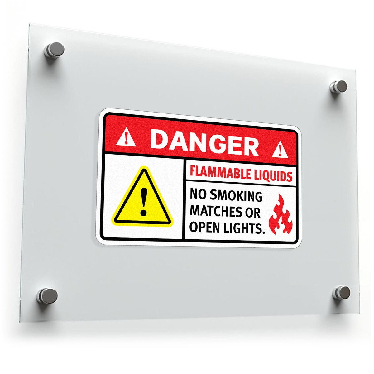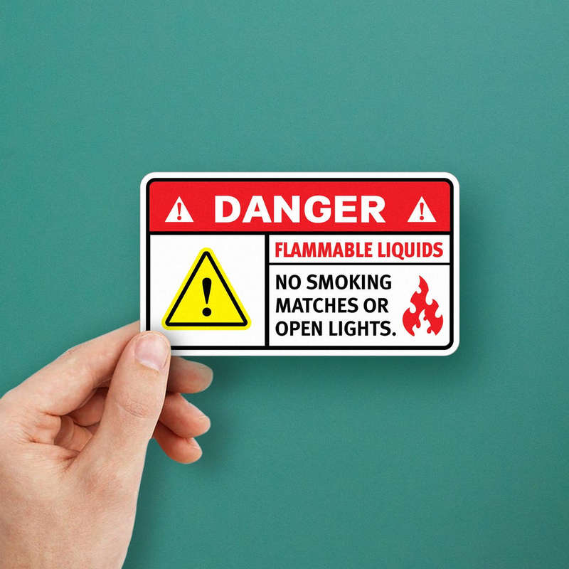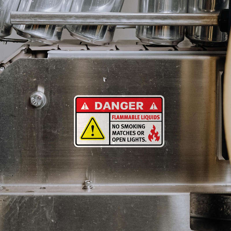 Promote fire safety with this “Danger Flammable Liquids No Smoking” sticker, specifically designed to remind personnel to avoid smoking, matches, or open lights around flammable materials. The eye-catching red, yellow, and black design ensures visibility, clearly communicating critical warnings in industrial and storage environments. Constructed from durable, weather-resistant materials, this decal is suitable for both indoor and outdoor use, holding up under various conditions. Available in multiple size options, this safety sticker can be applied easily to walls, doors, and storage containers, reinforcing fire hazard protocols and helping to prevent accidental ignition.