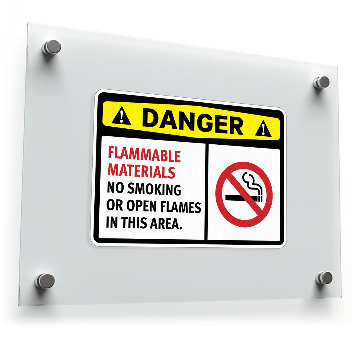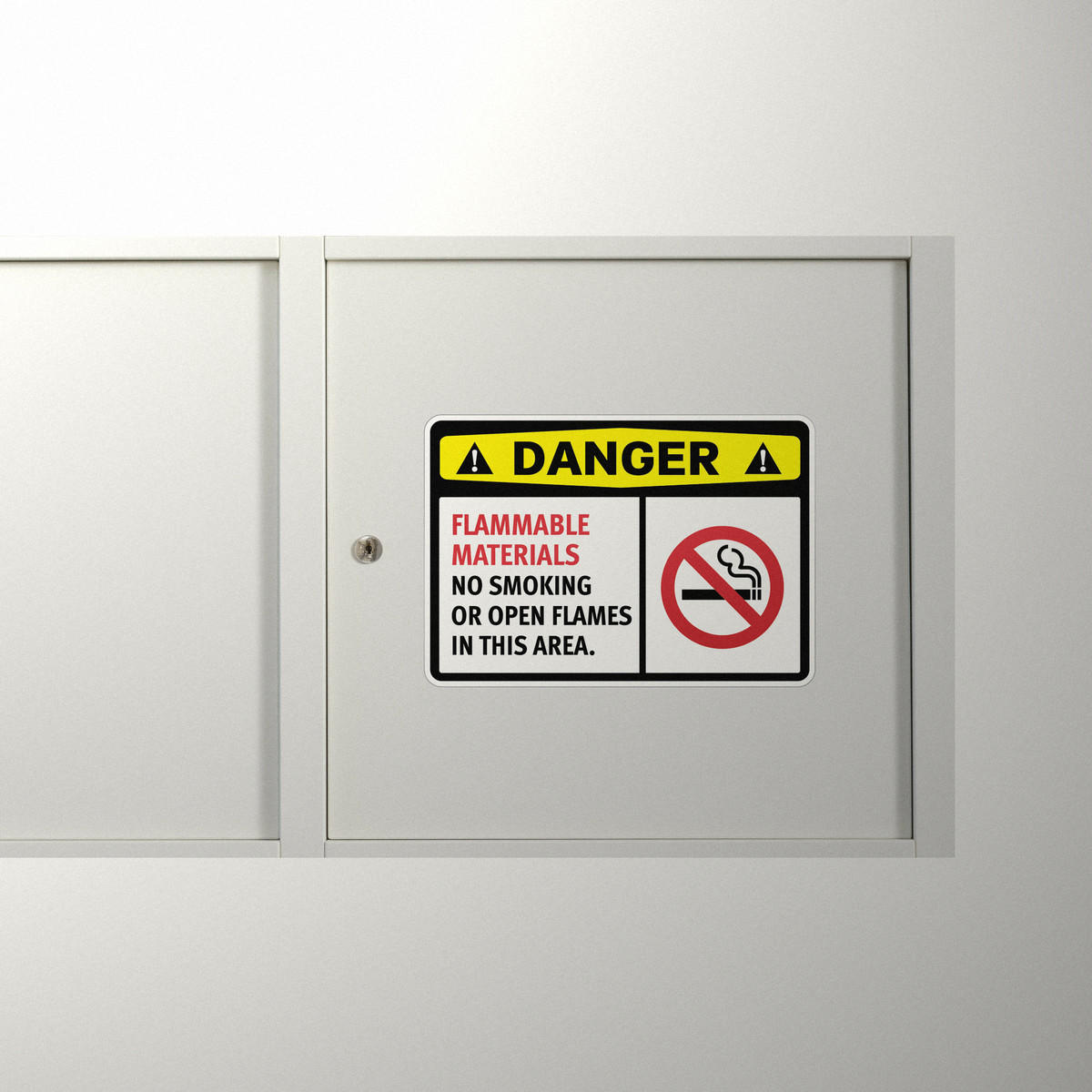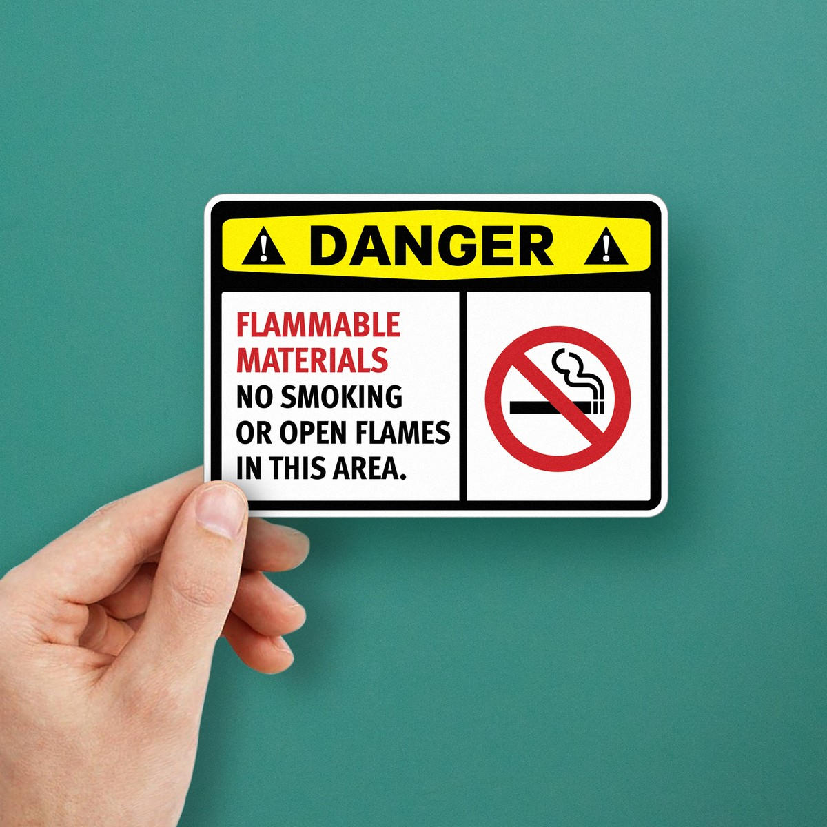 Ensure safety in hazardous areas with this bold “Danger: Flammable Materials” vinyl decal. Designed for industrial and workplace environments, this safety sticker communicates a clear message: no smoking or open flames in areas where flammable materials are present. Made from durable vinyl, this decal is built to withstand tough conditions while maintaining high visibility. The sticker can be easily applied and removed without leaving residue, making it a flexible option for changing safety needs. Available in multiple size options, this decal is essential for promoting safety and compliance in hazardous workspaces.