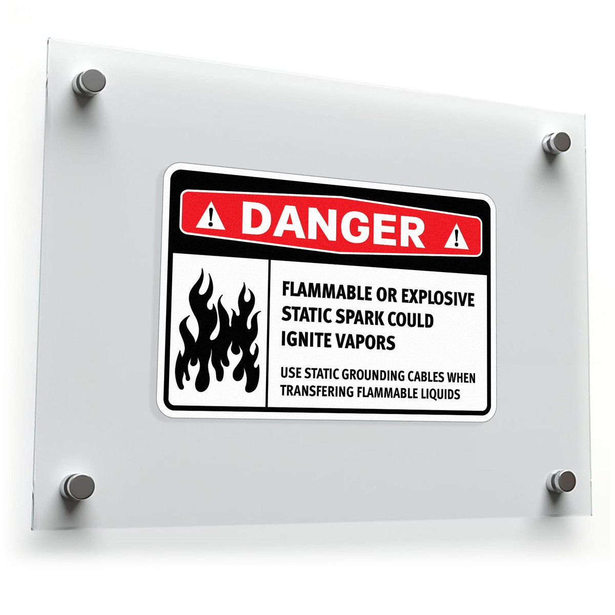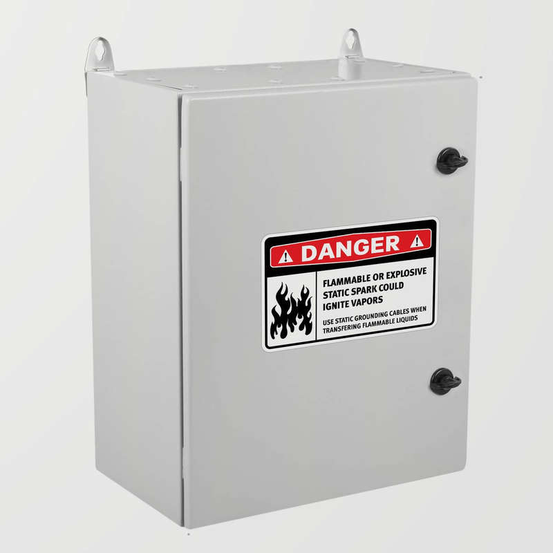 This “Danger Flammable or Explosive” warning sticker is essential for high-risk industrial settings, clearly alerting personnel to the dangers of static sparks near flammable liquids. The bold design in red, black, and white maximizes visibility, providing a clear message to use grounding cables during transfers. Made from durable vinyl, this decal is built to withstand demanding environments, ensuring its safety message remains intact over time. Available in multiple size options, this sticker enhances safety protocols in warehouses, chemical storage areas, and other facilities handling hazardous materials.