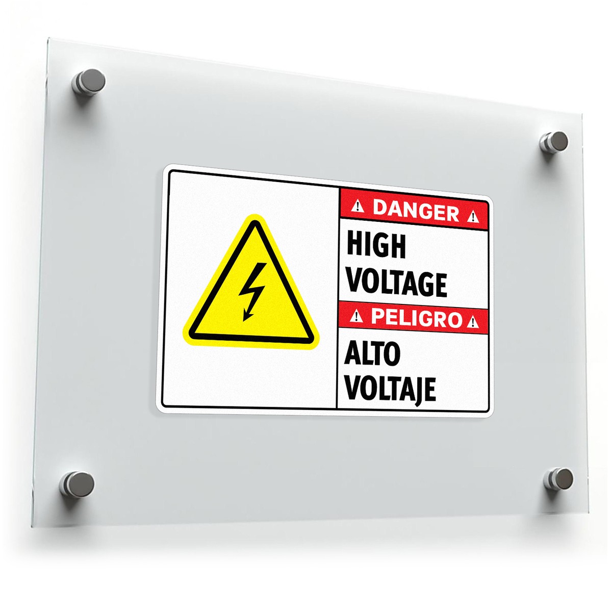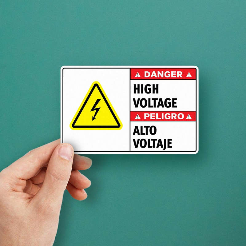 Enhance workplace safety with this bilingual “Danger High Voltage” decal, designed to warn of electrical hazards and restrict access to high-risk areas. Featuring bold red, yellow, and black colors with a high-voltage warning symbol, this vinyl sticker ensures high visibility and clear communication in multilingual environments. Crafted from durable vinyl, it resists wear, weather, and harsh industrial conditions, making it perfect for both indoor and outdoor use. The adhesive backing allows for easy application on doors, walls, or electrical equipment, and it removes cleanly without sticky residue. OSHA-compliant and easy to use, this safety decal is a vital tool for ensuring regulatory compliance and protecting workers.