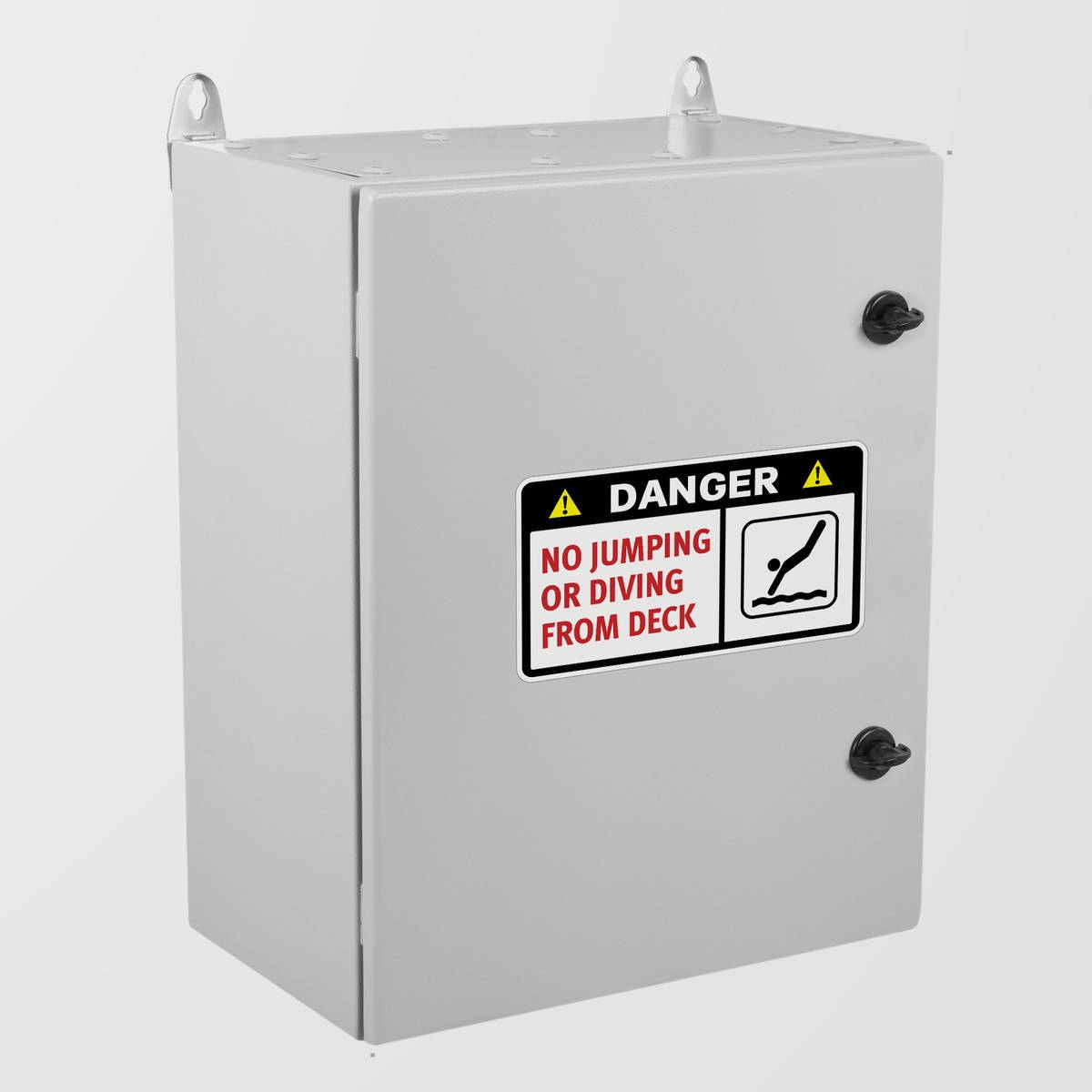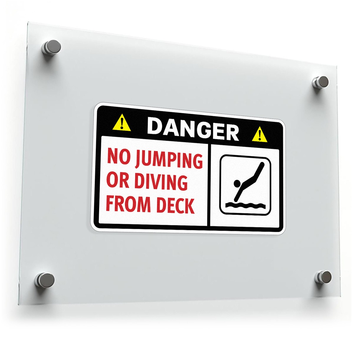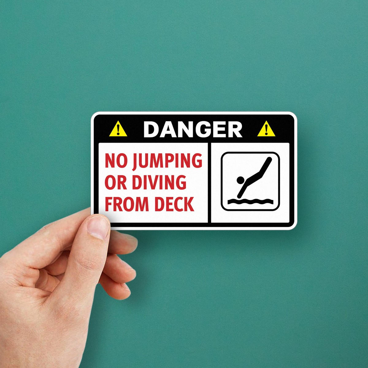 Ensure safety and compliance with this bold “Danger: No Jumping or Diving from Deck” sticker, designed for poolside areas, decks, and public spaces. Made from high-quality waterproof vinyl, this 6×3-inch decal offers long-lasting durability even in harsh outdoor conditions. Its clear and bold warning message helps prevent accidents by promoting safe behavior. The sticker is easy to apply and remove, making it perfect for both temporary and permanent use. Ensure the safety of your guests and maintain a secure environment with this highly visible safety decal.