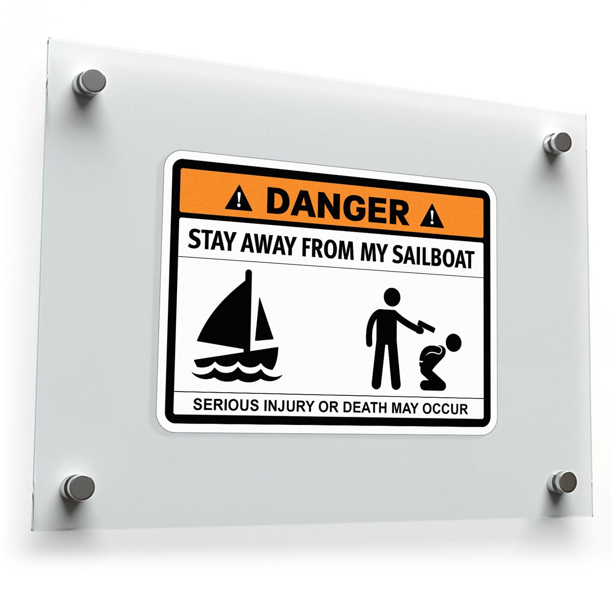 Enhance the safety of your sailboat with this high-visibility danger sticker, featuring a bold message, “Stay Away From My Sailboat – Serious Injury or Death May Occur.” The striking black and orange design ensures it is easily noticeable, helping to deter unwanted approaches and reinforce caution. Crafted from durable, waterproof materials, this decal is designed to withstand the marine environment, making it suitable for both indoor and outdoor applications. Available in multiple sizes, it’s easy to apply and remove without leaving residue, offering a simple and effective safety solution for boaters.