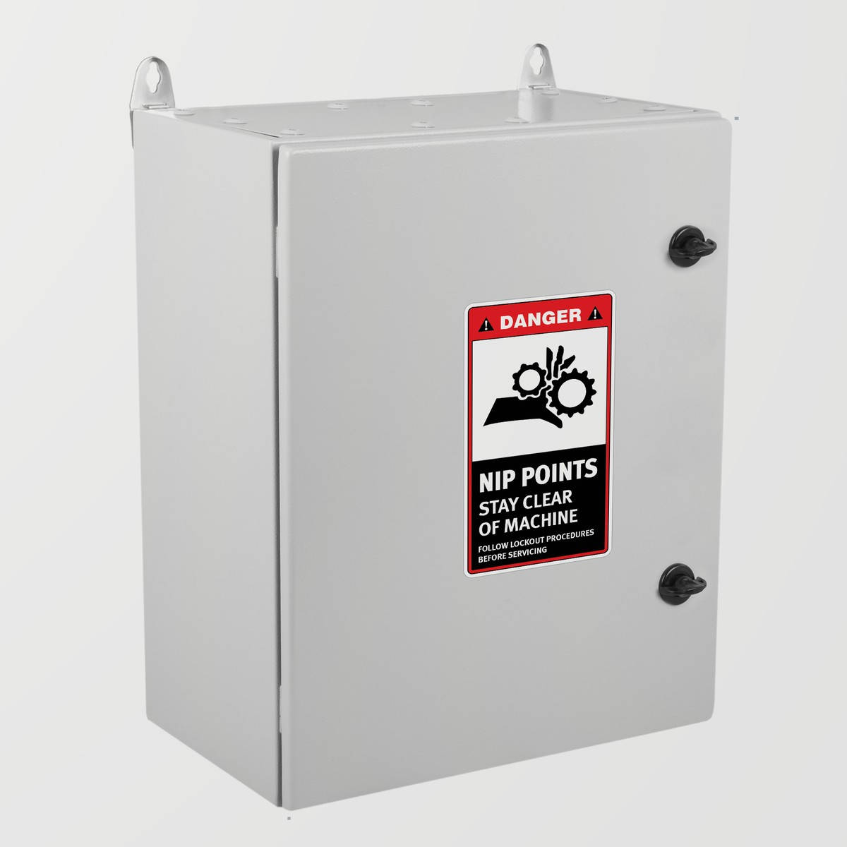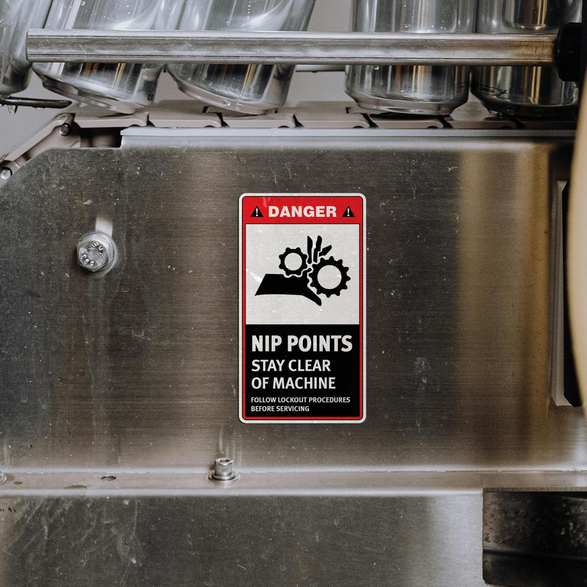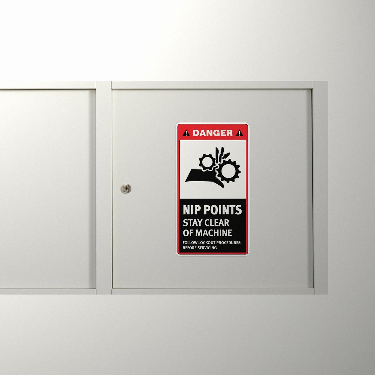 Danger Sign Sticker ⚠️ Critical Safety Warning: Ensure employee safety with this bold danger sign sticker, designed to alert workers to nip points and the importance of staying clear of machinery during operation. ⚠️