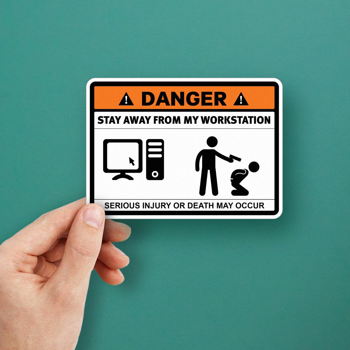 “Danger Stay Away from My Workstation” Safety Sticker ⚠️ Humorous Office Warning: This “Danger Stay Away from My Workstation” sticker provides a playful yet clear message to others to keep their distance from your computer setup. ⚠️