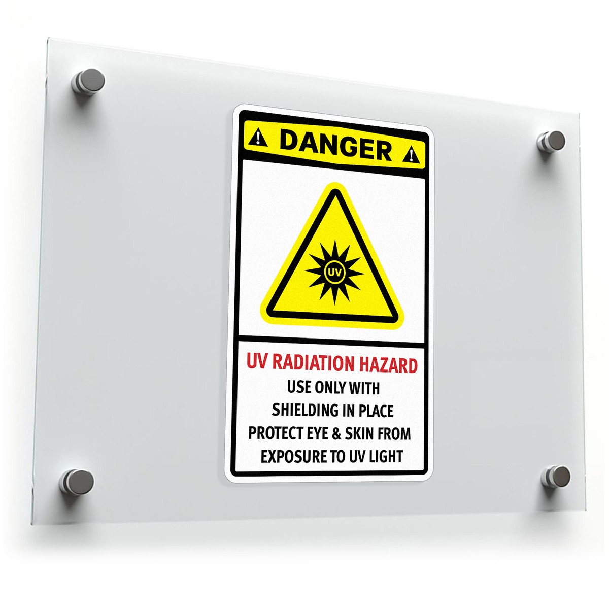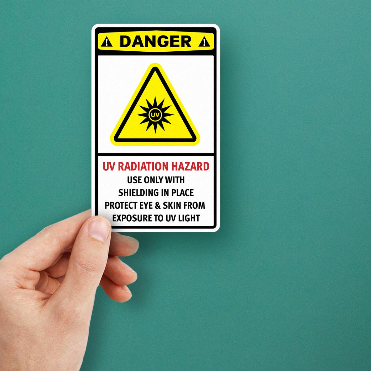 Ensure safety in hazardous UV light environments with this bold “Danger: UV Radiation Hazard” vinyl decal. Perfect for laboratories and industrial workspaces, this sticker delivers a clear message, reminding personnel to use shielding and protect their eyes and skin from exposure to UV light. Made from durable vinyl, this decal is built to withstand tough conditions while maintaining high visibility. It is easy to apply and remove, leaving no residue behind, making it a flexible and practical solution for any workspace. Available in multiple size options, this decal is essential for maintaining safety standards in UV-sensitive areas.