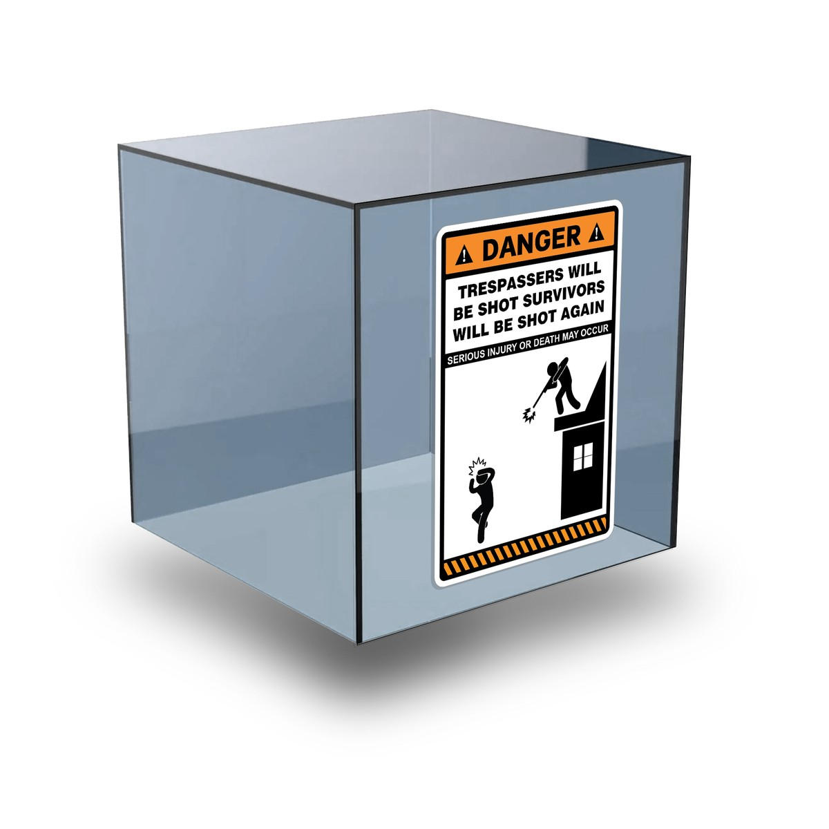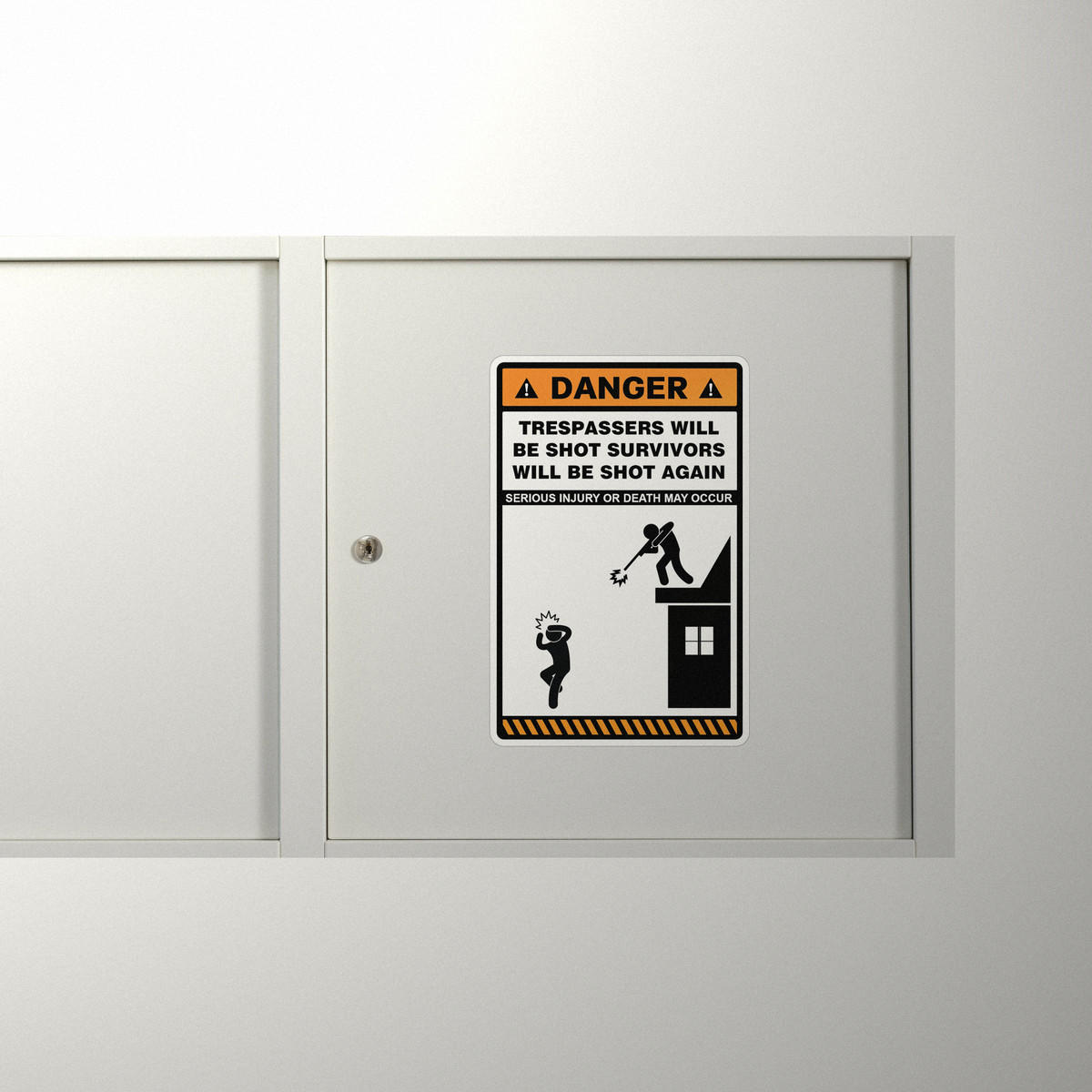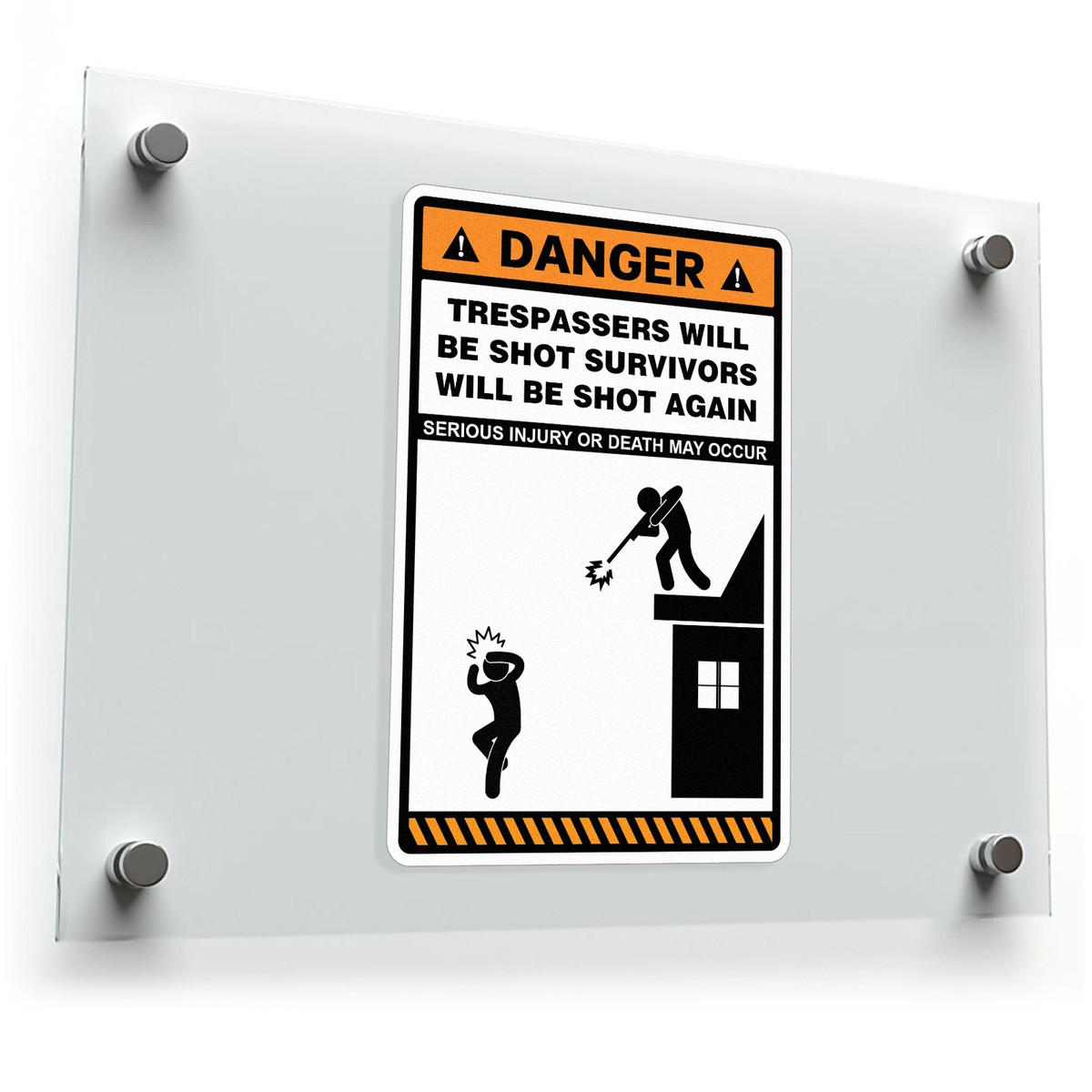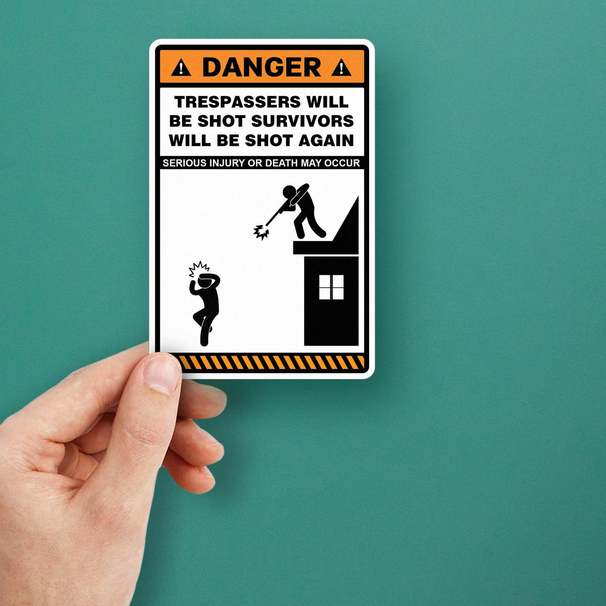 Ensure your property is well-protected with this bold and humorous “Danger: Trespassers Will Be Shot, Survivors Will Be Shot Again” vinyl warning sticker. Made from high-quality, weatherproof vinyl, this sticker is built to withstand outdoor conditions and ensures that your message is loud and clear. Ideal for gates, fences, and doors, it’s easy to apply and remove without leaving residue. With a high-visibility design, this sticker offers both functionality and a touch of humor, making it a great addition to your property’s security measures. Available in multiple size options to fit your specific needs.