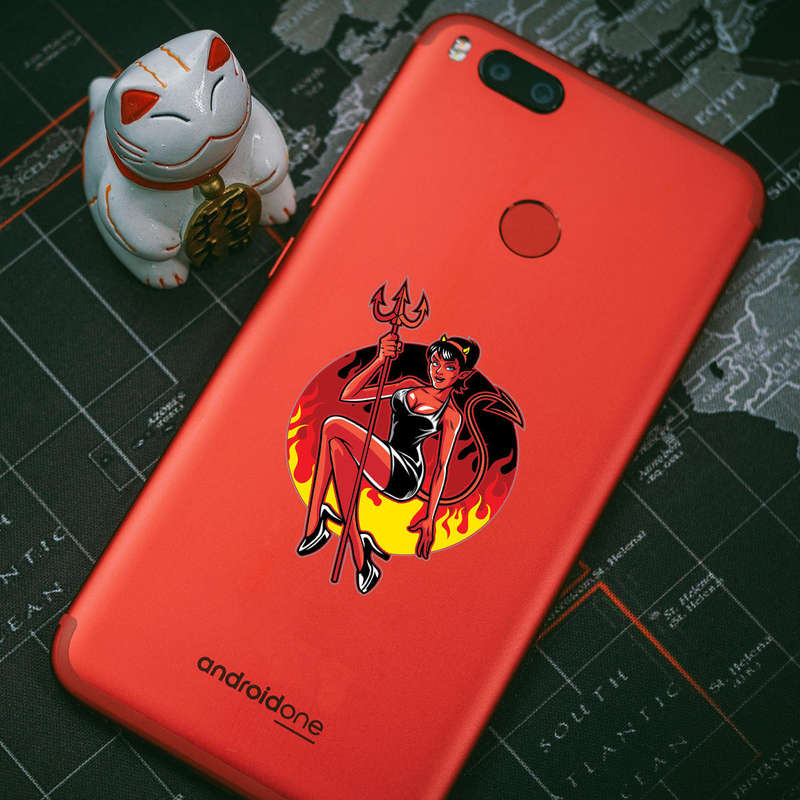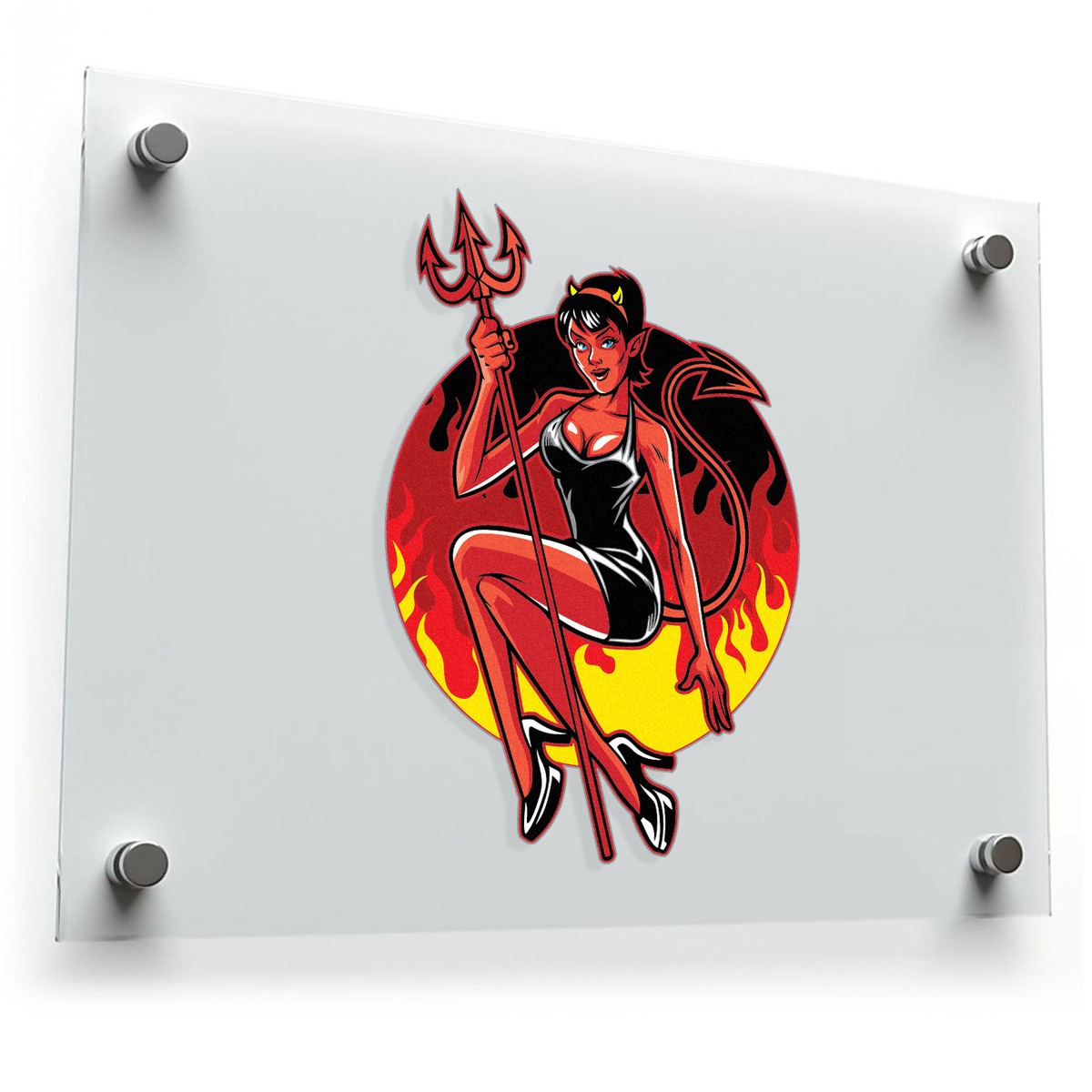 Devil Pin🔥 Fiery Pin-Up Design: This devil pin-up sticker features a bold flame background and a sultry retro design, perfect for adding a playful edge to your belongings or decor. 🔥