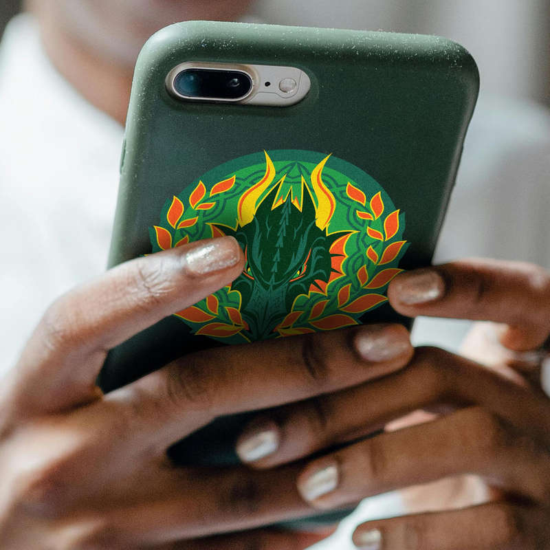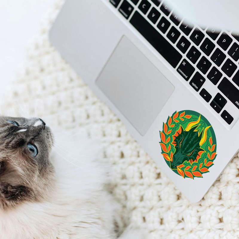 Showcase your passion for mythical art with this bold dragon crest sticker, featuring a vivid green and orange design adorned with laurel elements for a striking visual impact. Crafted from high-quality vinyl, this durable decal resists fading and weathering, making it suitable for both indoor and outdoor use. Its versatile design is perfect for cars, laptops, windows, and more, adding a dramatic and fantasy-inspired touch to your belongings. Easy to apply and remove without leaving residue, this sticker is available in multiple sizes, offering a flexible and eye-catching way to personalize your gear.