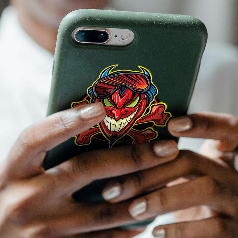 Unleash your wild side with this edgy devil skull sticker, featuring a bold red cartoon demon with crossbones in vibrant shades of red, black, and yellow. Perfect for bikes, cars, or laptops, this premium vinyl decal adds an intense, rebellious flair to any surface, crafted to endure various conditions without fading. Its removable design makes it easy to apply and remove without leaving residue, giving you the freedom to personalize and refresh your style. Available in multiple size options, this sticker is a must-have for anyone looking to make a unique, high-impact statement.