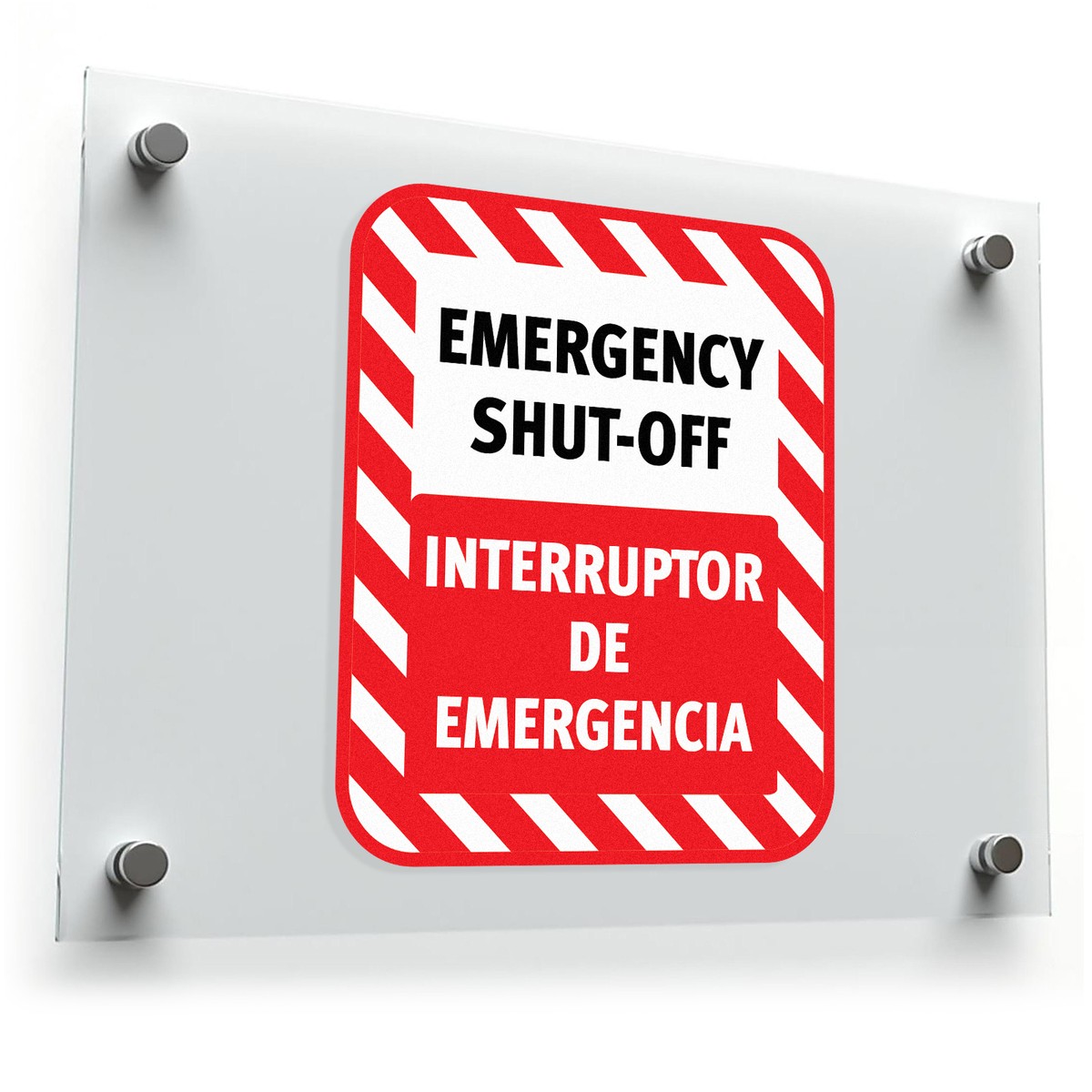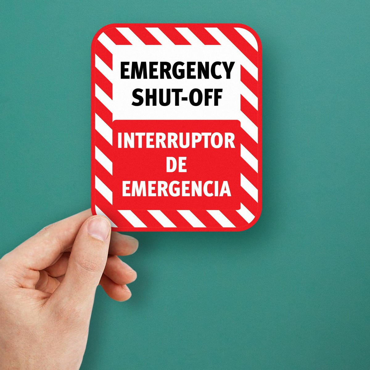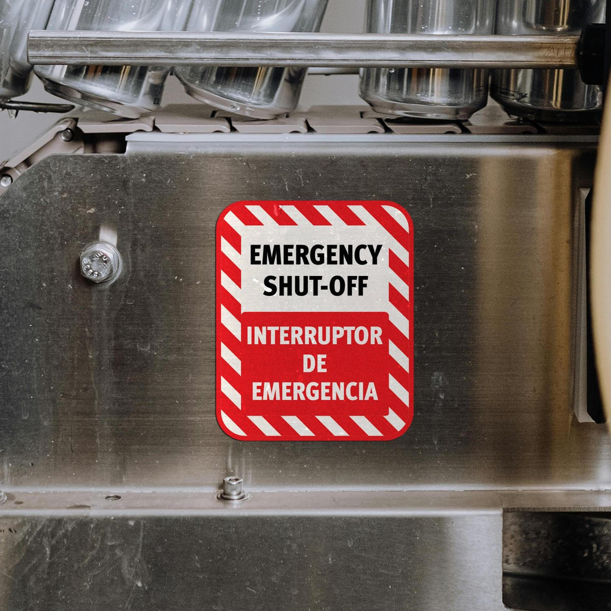 Enhance safety in your workplace with this bilingual “Emergency Shut-Off” safety sticker, featuring both English and Spanish (“Interruptor de Emergencia”) text for clear communication. Designed for industrial use, this durable, waterproof vinyl decal is perfect for marking emergency shut-off switches in factories, workshops, and construction sites. Its strong adhesive ensures the sticker stays in place, while the bold red and white design makes it highly visible. Compliant with OSHA standards, this sticker is essential for improving safety measures and ensuring quick responses in emergency situations.