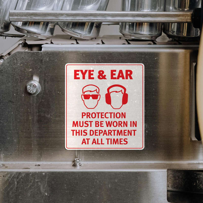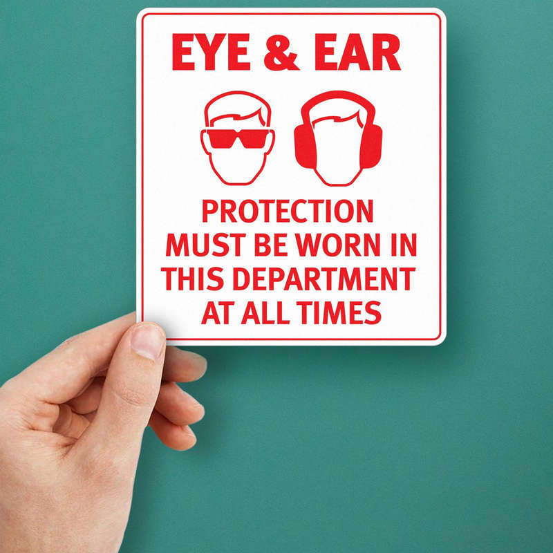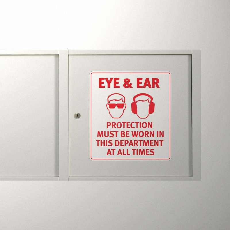 Promote safety and compliance in your workplace with this high-visibility eye and ear protection safety sign sticker. Crafted from durable, waterproof vinyl, this safety decal is designed for use in industrial sites, laboratories, and any environment where personal protective equipment (PPE) is required. The bold red and white design ensures that the sign stands out, keeping safety protocols clear and easily visible. With easy peel-and-stick application, it adheres to doors, walls, and equipment, and can be removed without leaving residue. Available in multiple sizes, this sticker is an essential addition to any safety-conscious environment.