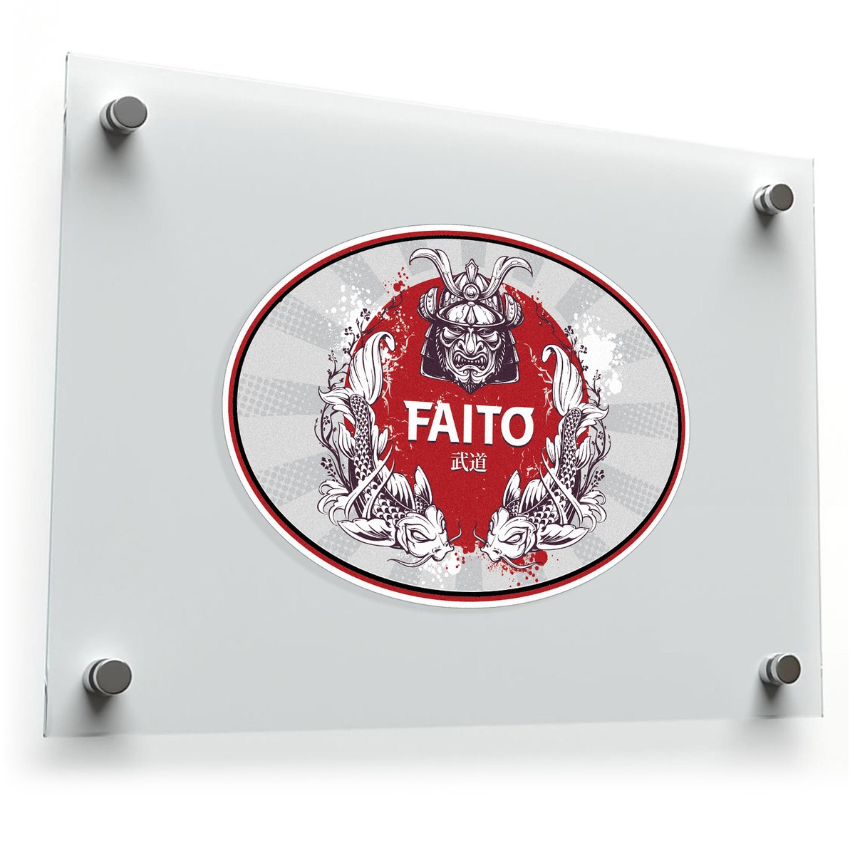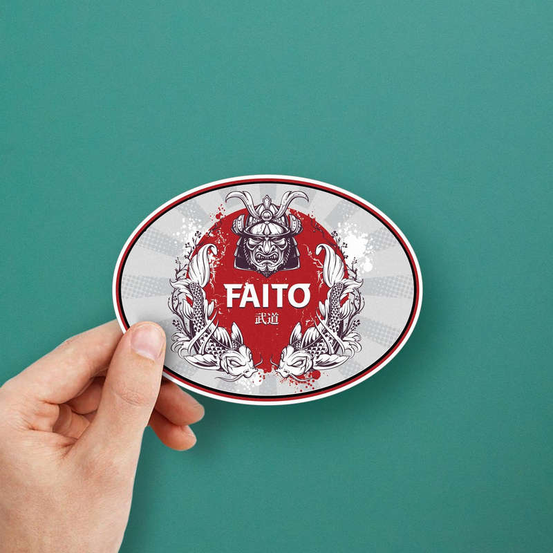 Celebrate Japanese artistry with this Faito samurai sticker, a striking oval-shaped decal featuring a detailed samurai helmet flanked by elegant koi fish against a vibrant red background. Crafted from durable vinyl, this sticker is waterproof and fade-resistant, making it ideal for both indoor and outdoor use. Whether applied to cars, laptops, walls, or other smooth surfaces, its bold red, white, and grey design ensures a captivating visual impact. Easy to apply and remove without residue, this decal offers a seamless way to showcase your appreciation for cultural elegance and artistic details. Available in multiple sizes.