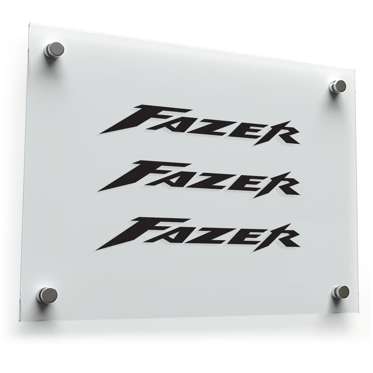 Show your love for your Yamaha Fazer with this Fazer logo sticker set. This set includes multiple decals featuring the model’s distinctive name in a dynamic, stylized font, a must-have for any Fazer owner. Made from high-quality, weather-resistant vinyl, these stickers are perfect for customizing your motorcycle fairings, helmet, fuel tank, windscreen, or any smooth surface. The sleek black and white design and durable material ensure that your stickers will last, showcasing your pride in your ride for years to come. This sticker set is more than just decoration; it’s a symbol of your passion for motorcycling. Available in Multiple Size Options. The sticker set includes three identical Fazer logo stickers. Each sticker features the word “FAZER” in a stylized, italicized font with sharp, angular edges. The primary color is black.