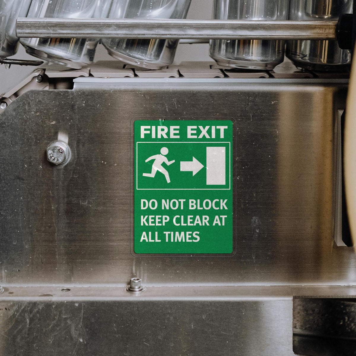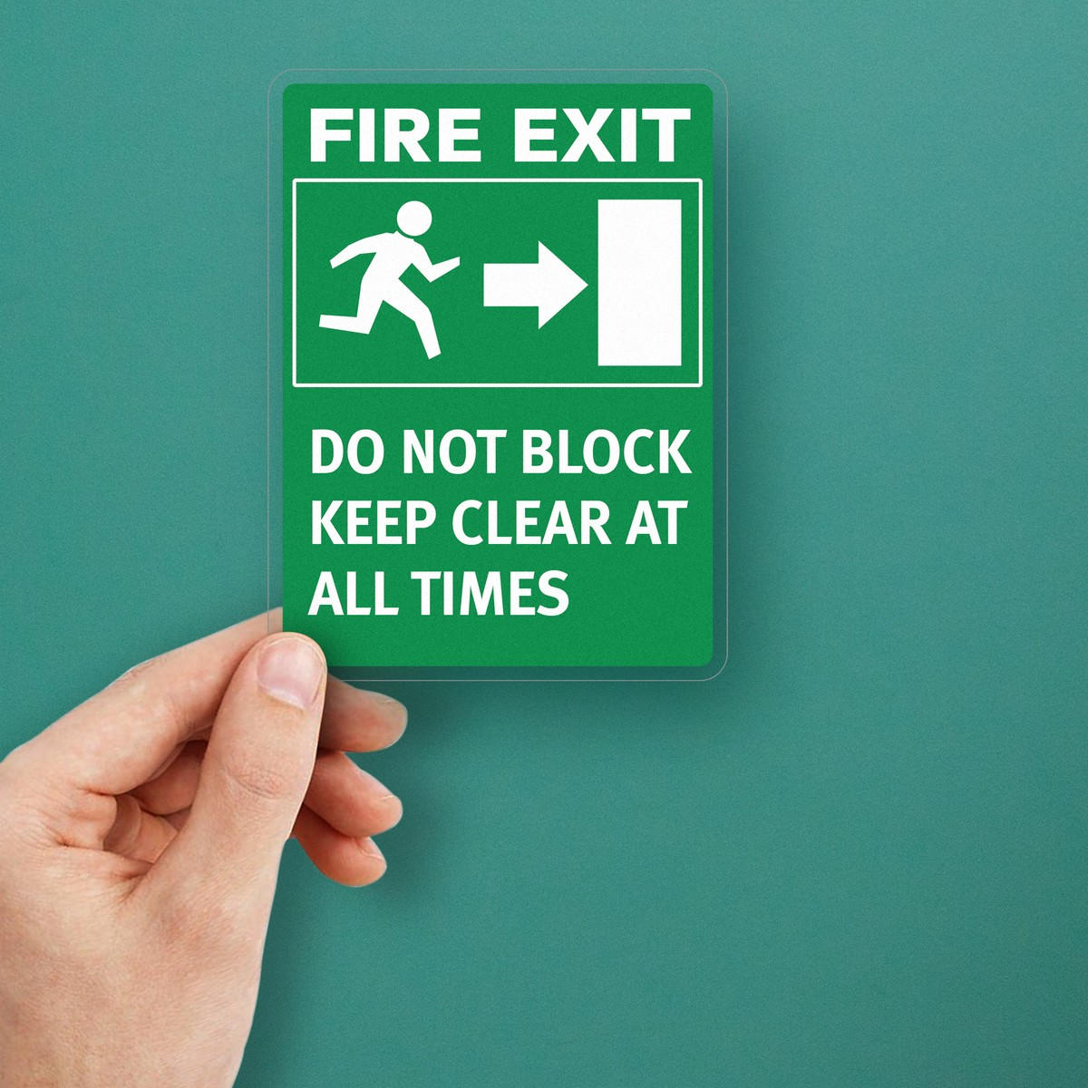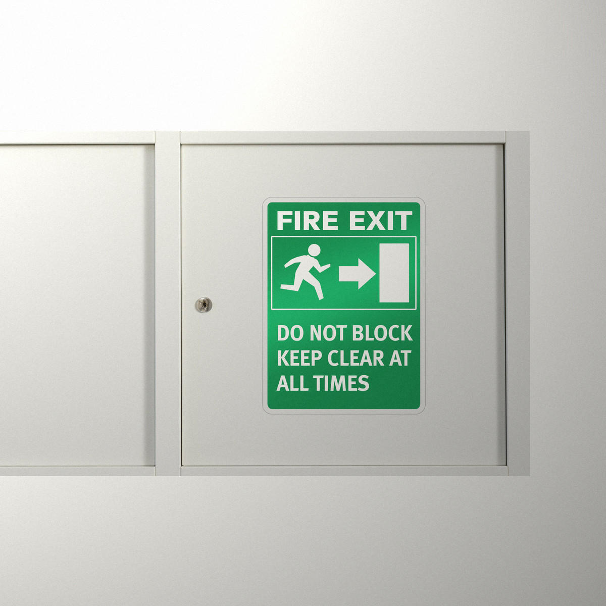 Ensure safety and compliance with this Fire Exit safety sign vinyl sticker, clearly displaying “Do Not Block, Keep Clear at All Times.” Ideal for industrial and commercial environments, this durable decal helps maintain clear emergency exit routes. Crafted from weatherproof vinyl, it withstands harsh indoor and outdoor conditions, ensuring long-lasting visibility. Easy to apply and remove without leaving residue, this fire exit sign is available in multiple sizes to suit your safety needs, offering clear and effective communication in high-traffic areas.