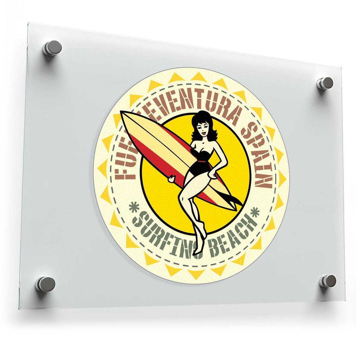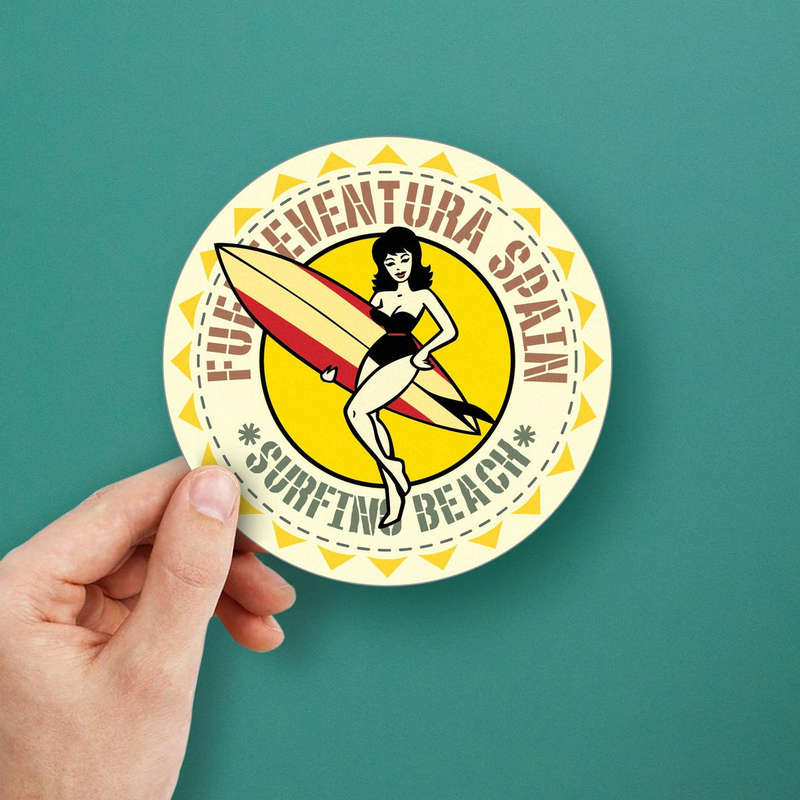 Celebrate the sunny spirit of Fuerteventura’s surfing culture with this retro-inspired decal, featuring a stylish surfer girl and classic surfboard design. Ideal for cars, laptops, water bottles, or travel gear, this vibrant sticker adds a splash of color and vintage charm to your belongings. Made from durable vinyl, it resists fading and peeling, making it perfect for outdoor use. Available in multiple size options, this easy peel-and-stick decal is quick to apply and remove, allowing you to customize your space effortlessly. Embrace the surf vibes of Fuerteventura, Spain, with this nostalgic beach decal!