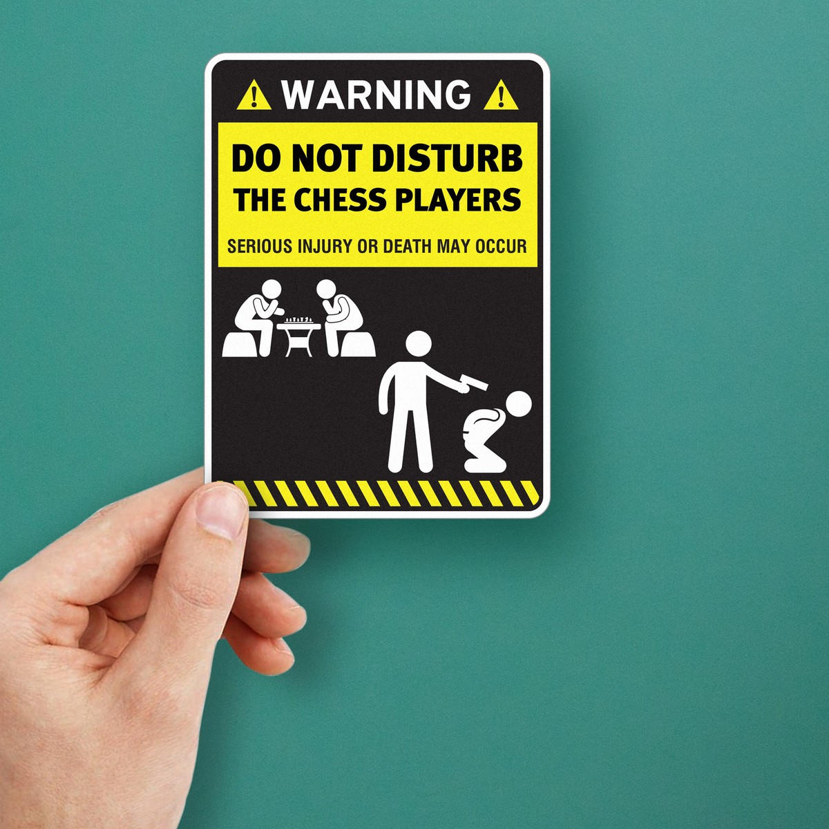 Add a touch of humor to your game room or chess-playing space with this funny “Do Not Disturb the Chess Players” warning sticker. Made from durable, weatherproof vinyl, this decal delivers a playful message while ensuring long-lasting use both indoors and outdoors. Its peel-and-stick application makes it easy to install on walls, doors, or any flat surface. The bold yellow and black design is eye-catching and perfect for chess enthusiasts who want to bring some fun to their intense matches. Available in multiple size options, this sticker makes for a great gift or fun addition to any chess player’s decor.