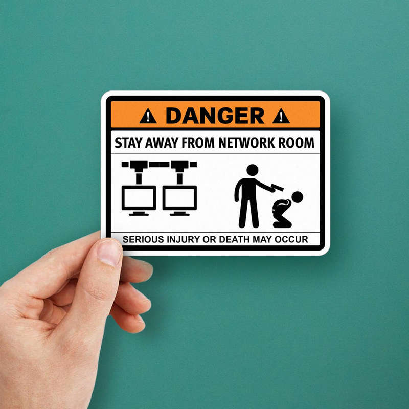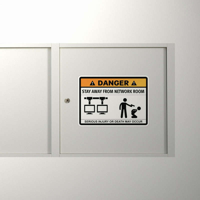 Ensure your network room stays secure with this bold “Stay Away from Network Room” danger sticker. Designed with a high-contrast orange, black, and white color scheme, this durable vinyl decal is perfect for IT professionals looking to protect sensitive equipment. Weatherproof and fade-resistant, it’s ideal for both indoor and outdoor use, offering long-lasting protection. With an easy peel-and-stick application, this sticker is hassle-free to install and remove without leaving residue. Available in various sizes, it provides a practical and humorous way to maintain a safe and restricted environment.